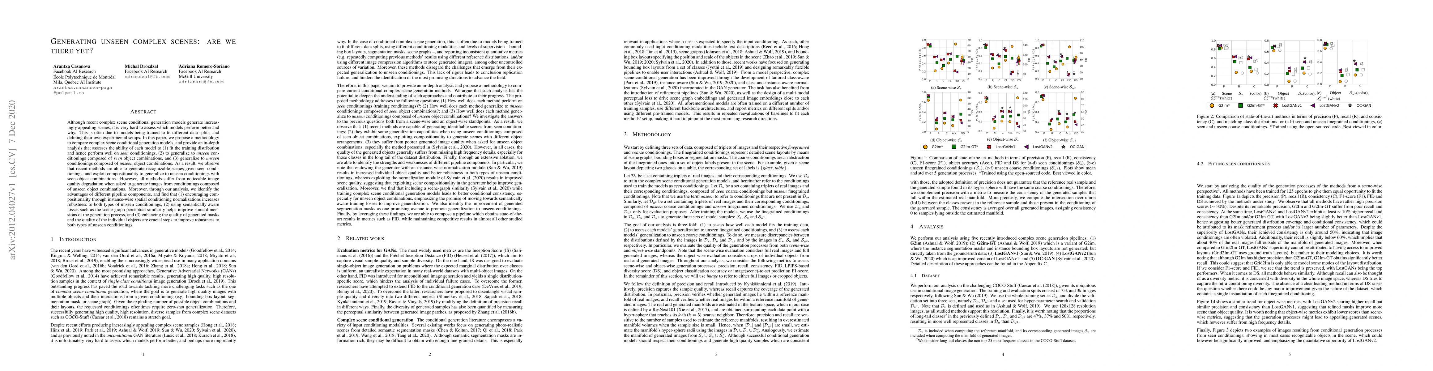 Although recent complex scene conditional generation models generate increasingly appealing scenes, it is very hard to assess which models perform better and why. This is often due to models being trained to fit different data splits, and defining their own experimental setups. In this paper, we propose a methodology to compare complex scene conditional generation models, and provide an in-depth analysis that assesses the ability of each model to (1) fit the training distribution and hence perform well on seen conditionings, (2) to generalize to unseen conditionings composed of seen object combinations, and (3) generalize to unseen conditionings composed of unseen object combinations. As a result, we observe that recent methods are able to generate recognizable scenes given seen conditionings, and exploit compositionality to generalize to unseen conditionings with seen object combinations. However, all methods suffer from noticeable image quality degradation when asked to generate images from conditionings composed of unseen object combinations. Moreover, through our analysis, we identify the advantages of different pipeline components, and find that (1) encouraging compositionality through instance-wise spatial conditioning normalizations increases robustness to both types of unseen conditionings, (2) using semantically aware losses such as the scene-graph perceptual similarity helps improve some dimensions of the generation process, and (3) enhancing the quality of generated masks and the quality of the individual objects are crucial steps to improve robustness to both types of unseen conditionings.