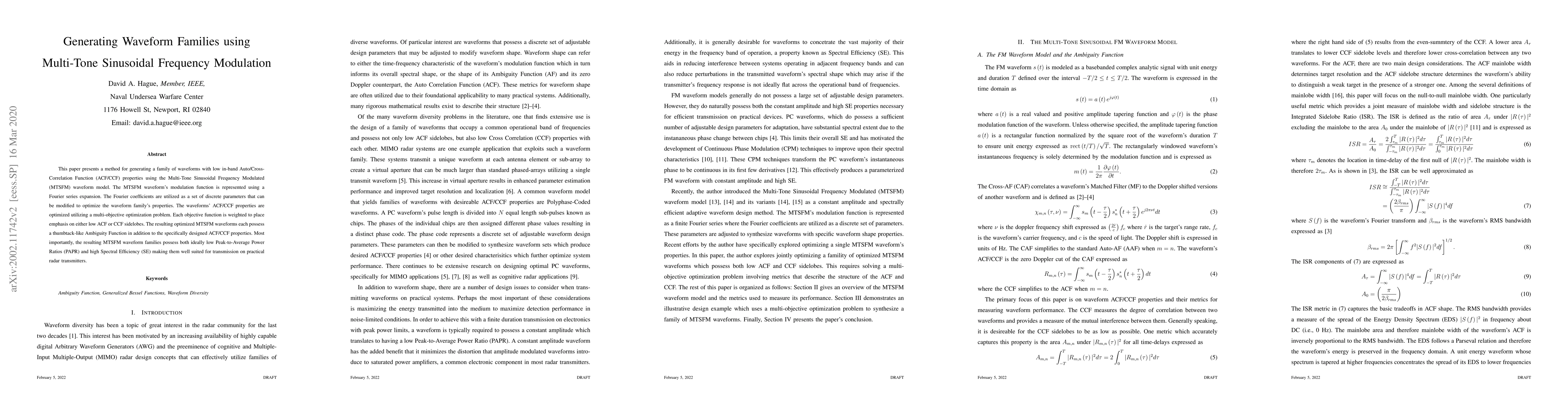 This paper presents a method for generating a family of waveforms with low in-band Auto/Cross-Correlation Function (ACF/CCF) properties using the Multi-Tone Sinusoidal Frequency Modulated (MTSFM) waveform model. The MTSFM waveform's modulation function is represented using a Fourier series expansion. The Fourier coefficients are utilized as a set of discrete parameters that can be modified to optimize the waveform family's properties. The waveforms' ACF/CCF properties are optimized utilizing a multi-objective optimization problem. Each objective function is weighted to place emphasis on either low ACF or CCF sidelobes. The resulting optimized MTSFM waveforms each possess a thumbtack-like Ambiguity Function in addition to the specifically designed ACF/CCF properties. Most importantly, the resulting MTSFM waveform families possess both ideally low Peak-to-Average Power Ratios (PAPR) and high Spectral Efficiency (SE) making them well suited for transmission on practical radar transmitters.