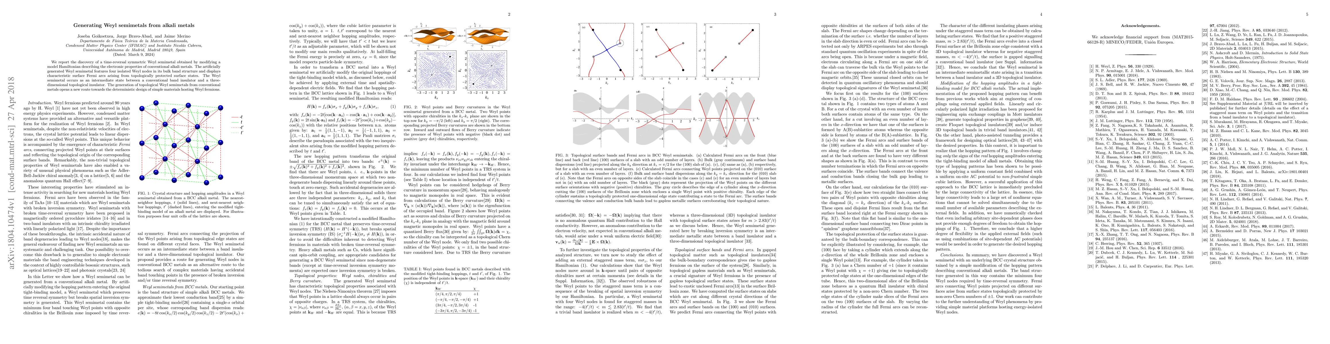 This paper reports the creation of a Weyl semimetal from alkali metals by modifying their electronic Hamiltonian, resulting in a material with four Weyl nodes and topologically protected surface Fermi arcs. This discovery provides a new pathway for designing materials with Weyl fermions.