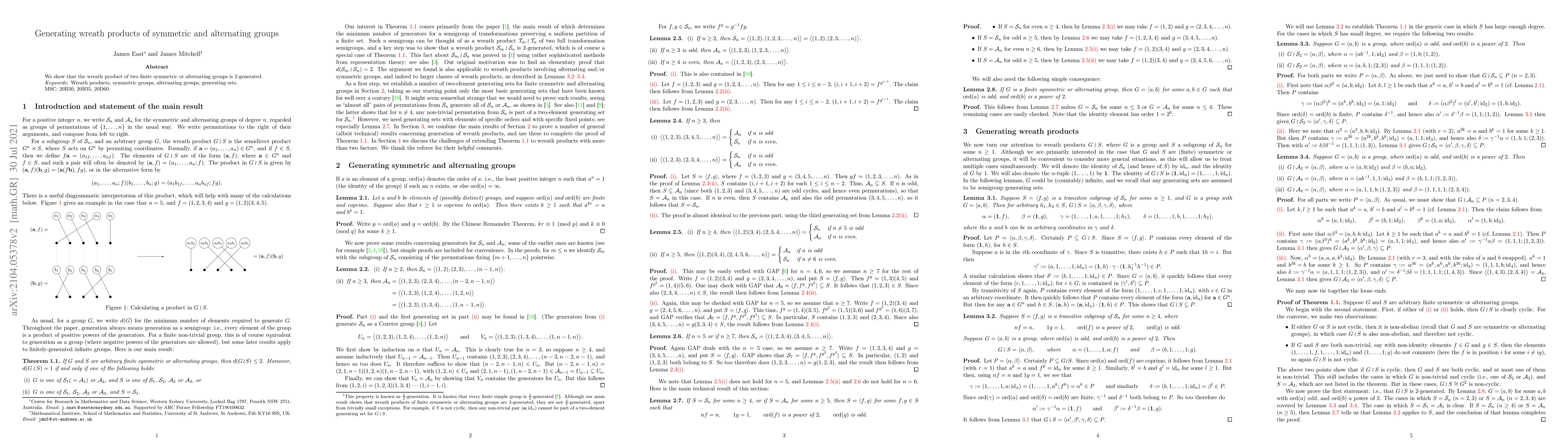 Summary: The paper demonstrates that the wreath product of two finite symmetric or alternating groups can be generated by just two elements. This result highlights the structural simplicity of these groups when combined through the wreath product operation.