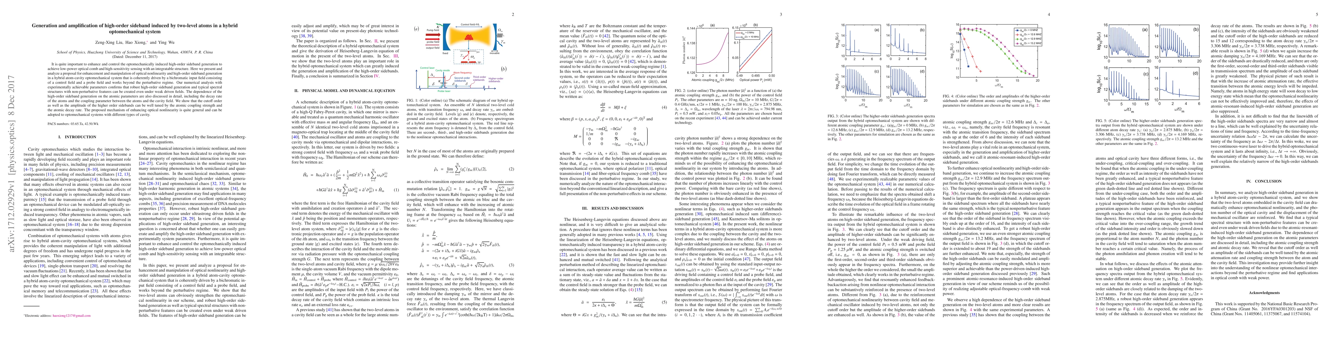 It is quite important to enhance and control the optomechanically induced high-order sideband generation to achieve low-power optical comb and high-sensitivity sensing with an integratable structure. Here we present and analyze a proposal for enhancement and manipulation of optical nonlinearity and high-order sideband generation in a hybrid atom-cavity optomechanical system that is coherently driven by a bichromatic input field consisting of a control field and a probe field and works beyond the perturbative regime. Our numerical analysis with experimentally achievable parameters confirms that robust high-order sideband generation and typical spectral structures with non-perturbative features can be created even under weak driven fields. The dependence of the high-order sideband generation on the atomic parameters are also discussed in detail, including the decay rate of the atoms and the coupling parameter between the atoms and the cavity field. We show that the cutoff order as well as the amplitude of the higher order sidebands can be well tuned by the atomic coupling strength and the atomic decay rate. The proposed mechanism of enhancing optical nonlinearity is quite general and can be adopted to optomechanical systems with different types of cavity.