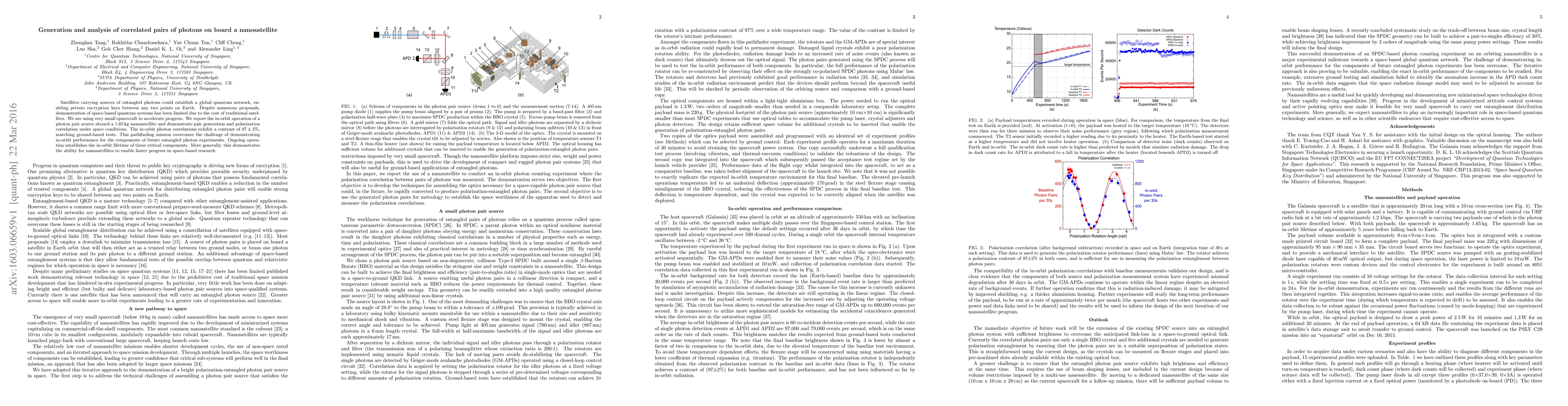 Satellites carrying sources of entangled photons could establish a global quantum network, enabling private encryption keys between any two points on Earth. Despite numerous proposals, demonstration of space-based quantum systems has been limited due to the cost of traditional satellites. We are using very small spacecraft to accelerate progress. We report the in-orbit operation of a photon pair source aboard a 1.65 kg nanosatellite and demonstrate pair generation and polarization correlation under space conditions. The in-orbit photon correlations exhibit a contrast of 97+/-2%, matching ground-based tests. This pathfinding mission overcomes the challenge of demonstrating in-orbit performance for the components of future entangled photon experiments. Ongoing operation establishes the in-orbit lifetime of these critical components. More generally, this demonstrates the ability for nanosatellites to enable faster progress in space-based research.