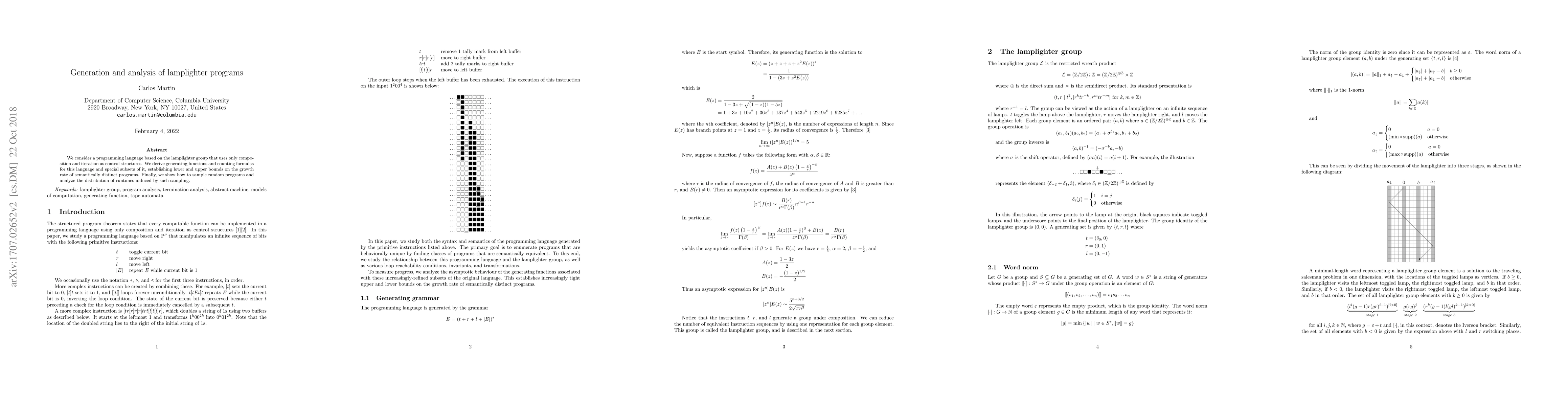 We consider a programming language based on the lamplighter group that uses only composition and iteration as control structures. We derive generating functions and counting formulas for this language and special subsets of it, establishing lower and upper bounds on the growth rate of semantically distinct programs. Finally, we show how to sample random programs and analyze the distribution of runtimes induced by such sampling.