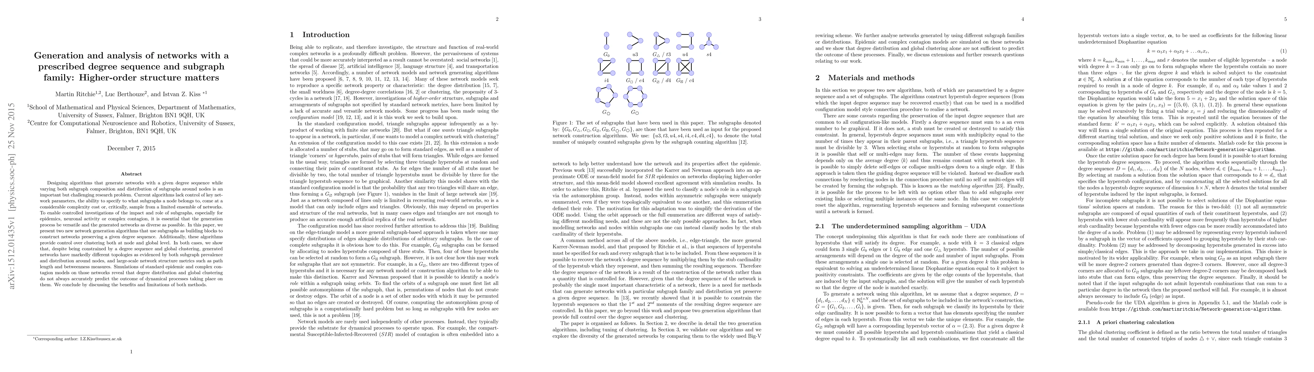 Designing algorithms that generate networks with a given degree sequence while varying both subgraph composition and distribution of subgraphs around nodes is an important but challenging research problem. Current algorithms lack control of key network parameters, the ability to specify to what subgraphs a node belongs to, come at a considerable complexity cost or, critically, sample from a limited ensemble of networks. To enable controlled investigations of the impact and role of subgraphs, especially for epidemics, neuronal activity or complex contagion, it is essential that the generation process be versatile and the generated networks as diverse as possible. In this paper, we present two new network generation algorithms that use subgraphs as building blocks to construct networks preserving a given degree sequence. Additionally, these algorithms provide control over clustering both at node and global level. In both cases, we show that, despite being constrained by a degree sequence and global clustering, generated networks have markedly different topologies as evidenced by both subgraph prevalence and distribution around nodes, and large-scale network structure metrics such as path length and betweenness measures. Simulations of standard epidemic and complex contagion models on those networks reveal that degree distribution and global clustering do not always accurately predict the outcome of dynamical processes taking place on them. We conclude by discussing the benefits and limitations of both methods.