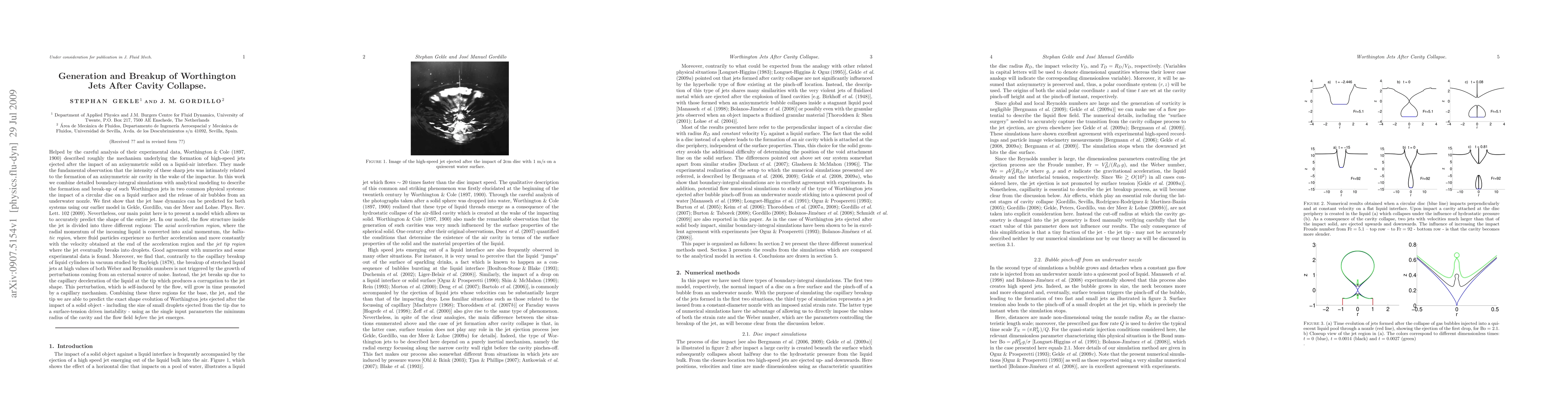 This study combines boundary-integral simulations and analytical modeling to predict the formation and breakup of Worthington jets, focusing on both disc impacts on liquid surfaces and underwater bubble releases. The research finds that jet breakup is driven by self-induced capillary deceleration rather than external perturbations, enabling accurate prediction of jet shape and droplet size based on cavity radius and pre-jet flow field.
