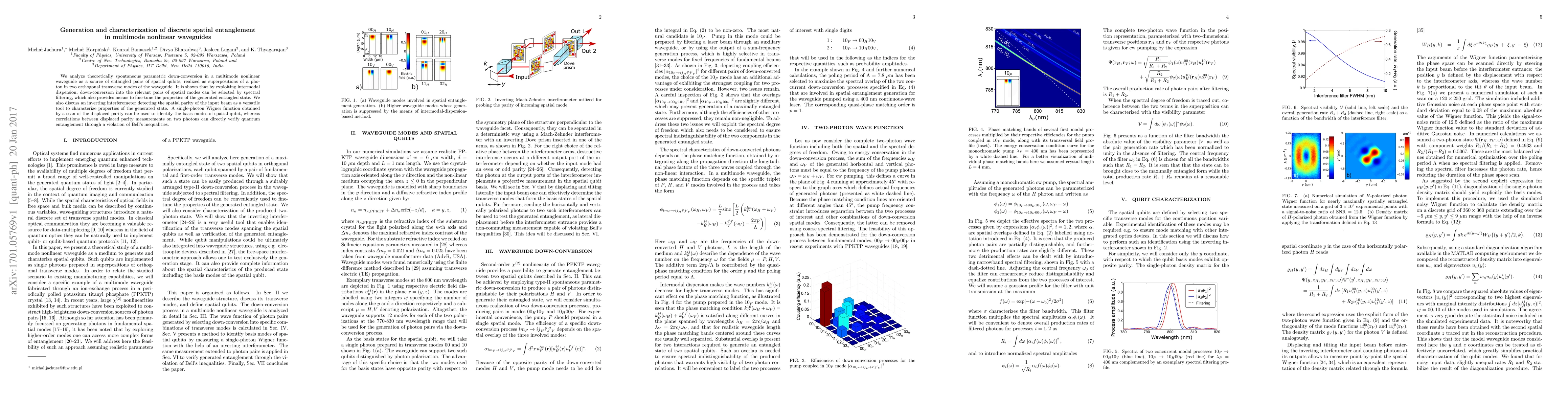 This paper theoretically explores the generation of spatial entanglement in multimode nonlinear waveguides via spontaneous parametric down-conversion, utilizing intermodal dispersion and spectral filtering to select and fine-tune entangled photon pairs. It also introduces an inverting interferometer for characterizing the entangled state through spatial parity measurements and Bell's inequality tests.