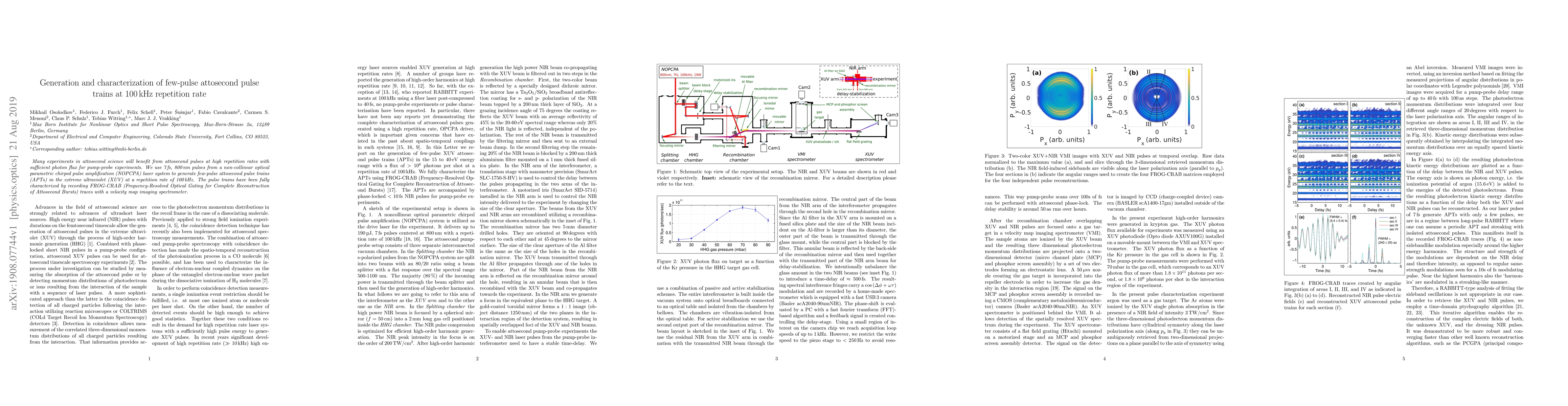 Many experiments in attosecond science will benefit from attosecond pulses at high repetition rates with sufficient photon flux for pump-probe experiments. We use 7fs, 800nm pulses from a non-collinear optical parametric chirped pulse amplification (NOPCPA) laser system to generate few-pulse attosecond pulse trains (APTs) in the extreme ultraviolet (XUV) at a repetition rate of 100kHz. The pulse trains have been fully characterized by recording FROG-CRAB (Frequency-Resolved Optical Gating for Complete Reconstruction of Attosecond Bursts) traces with a velocity map imaging spectrometer.