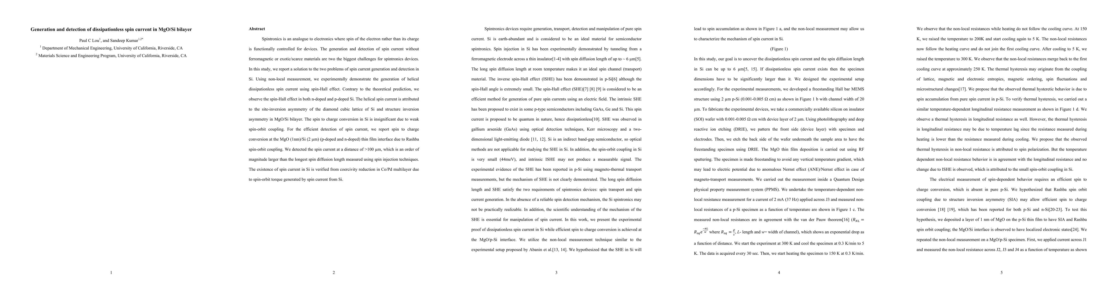 Researchers successfully generate dissipationless spin current in silicon using a non-local measurement technique, overcoming two major challenges for spintronics devices. The spin current can be detected at distances much larger than previously measured using similar methods.