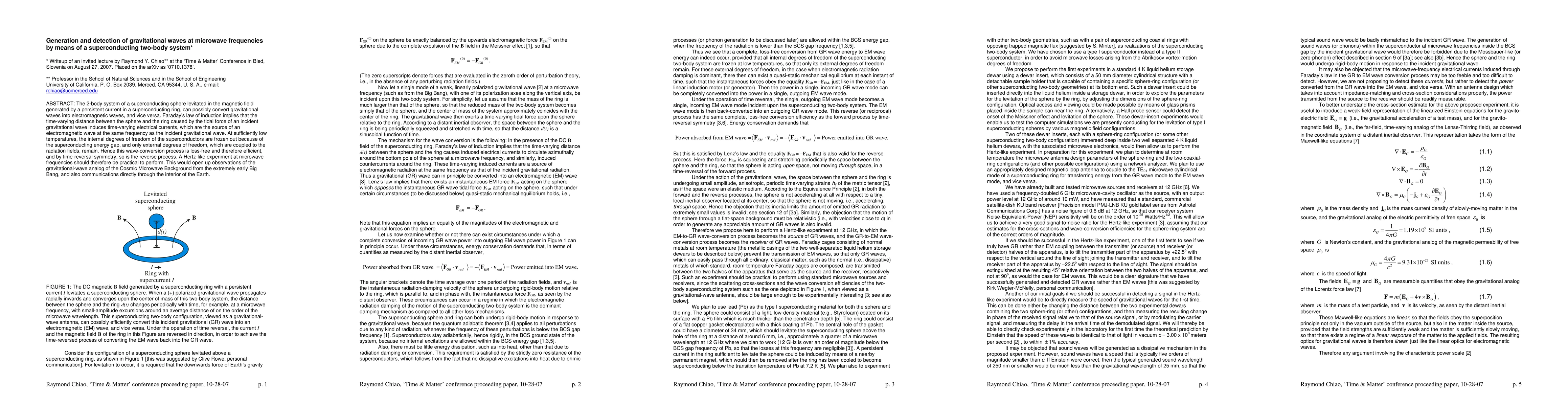 The 2-body system of a superconducting sphere levitated in the magnetic field generated by a persistent current in a superconducting ring, can possibly convert gravitational waves into electromagnetic waves, and vice versa. Faraday's law of induction implies that the time-varying distance between the sphere and the ring caused by the tidal force of an incident gravitational wave induces time-varying electrical currents, which are the source of an electromagnetic wave at the same frequency as the incident gravitational wave. At sufficiently low temperatures, the internal degrees of freedom of the superconductors are frozen out because of the superconducting energy gap, and only external degrees of freedom, which are coupled to the radiation fields, remain. Hence this wave-conversion process is loss-free and therefore efficient, and by time-reversal symmetry, so is the reverse process. A Hertz-like experiment at microwave frequencies should therefore be practical to perform. This would open up observations of the gravitational-wave analog of the Cosmic Microwave Background from the extremely early Big Bang, and also communications directly through the interior of the Earth.