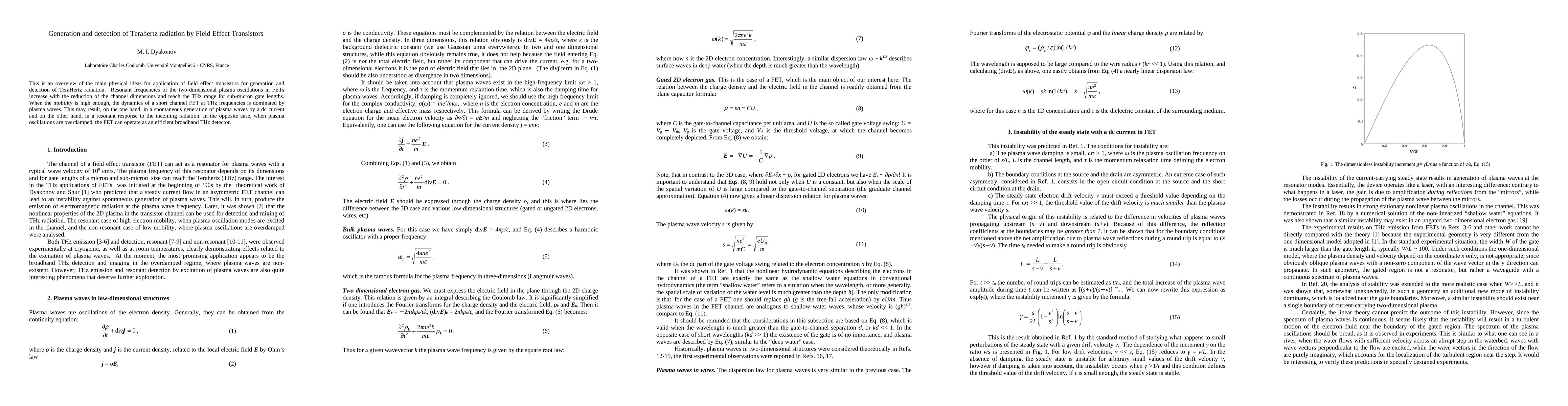 This paper explores the use of field effect transistors (FETs) for generating and detecting Terahertz (THz) radiation, highlighting that reduced channel dimensions lead to resonant frequencies in the THz range. High mobility enables spontaneous THz wave generation and resonant response, while overdamped oscillations allow FETs to function as efficient broadband THz detectors.