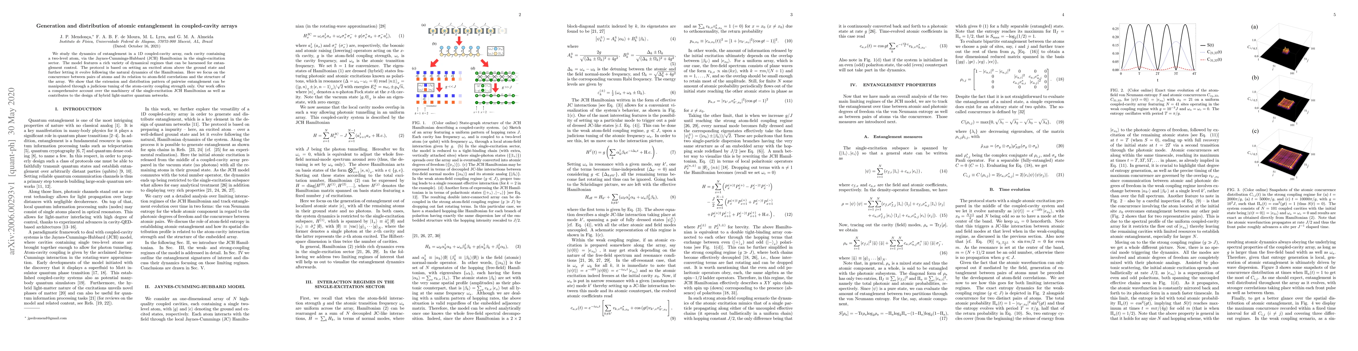 This paper investigates the dynamics of atomic entanglement in a 1D coupled-cavity array using the Jaynes-Cummings-Hubbard Hamiltonian, demonstrating that entanglement distribution can be controlled by tuning the atom-cavity coupling strength, which has implications for designing quantum networks.