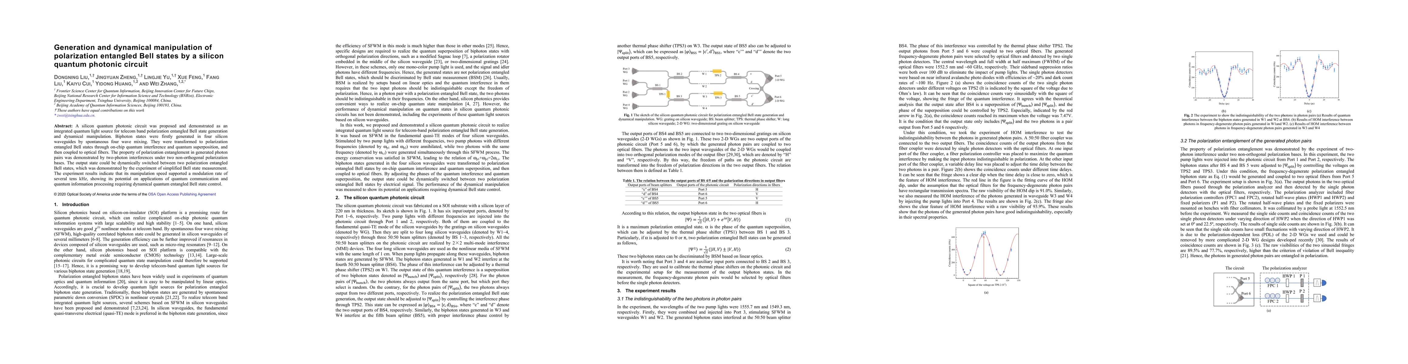 This paper proposes and demonstrates a silicon quantum photonic circuit for generating and dynamically manipulating polarization entangled Bell states in the telecom band. The circuit generates biphoton states via spontaneous four wave mixing and transforms them into Bell states through on-chip quantum interference, enabling dynamic switching between states at modulation rates of several tens kHz, promising applications in quantum communication and information processing.
