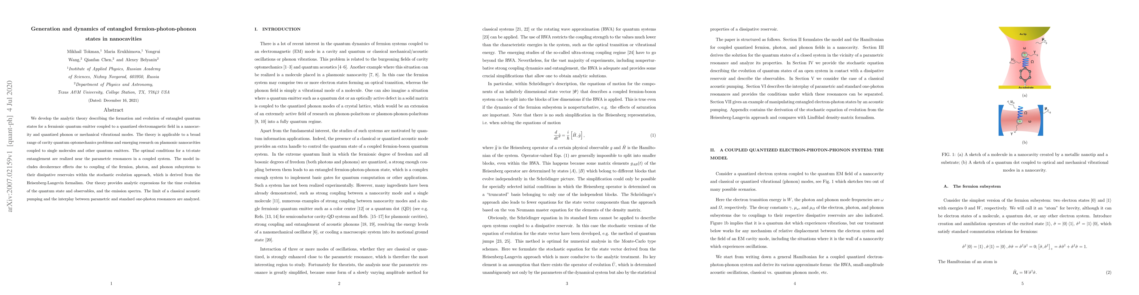 Researchers developed an analytic theory for entangled fermion-photon-phonon states in nanocavities, predicting optimal conditions for tri-state entanglement near parametric resonances. The model accounts for decoherence effects and emission spectra, shedding light on quantum optomechanics and plasmonic nanocavities.