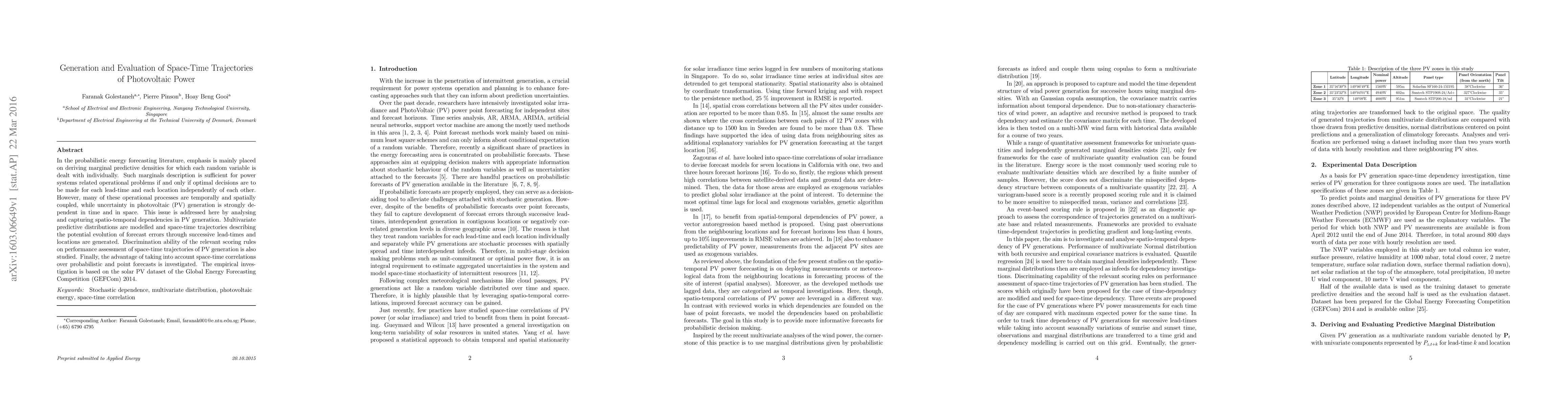 In the probabilistic energy forecasting literature, emphasis is mainly placed on deriving marginal predictive densities for which each random variable is dealt with individually. Such marginals description is sufficient for power systems related operational problems if and only if optimal decisions are to be made for each lead-time and each location independently of each other. However, many of these operational processes are temporally and spatially coupled, while uncertainty in photovoltaic (PV) generation is strongly dependent in time and in space. This issue is addressed here by analysing and capturing spatio-temporal dependencies in PV generation. Multivariate predictive distributions are modelled and space-time trajectories describing the potential evolution of forecast errors through successive lead-times and locations are generated. Discrimination ability of the relevant scoring rules on performance assessment of space-time trajectories of PV generation is also studied. Finally, the advantage of taking into account space-time correlations over probabilistic and point forecasts is investigated. The empirical investigation is based on the solar PV dataset of the Global Energy Forecasting Competition (GEFCom) 2014.