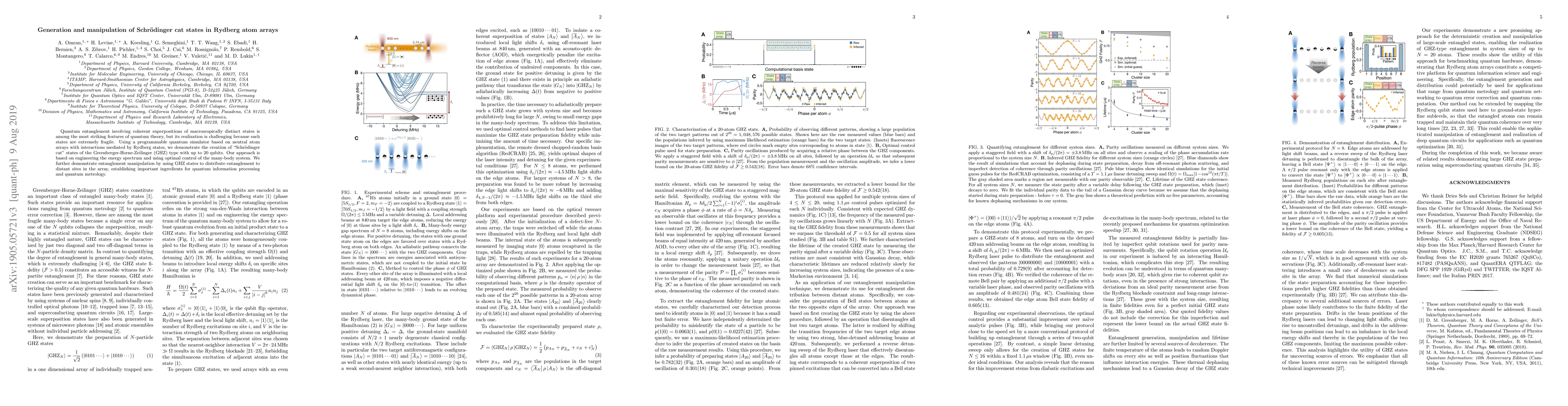 This paper demonstrates the creation and manipulation of Schrödinger cat states in a programmable quantum simulator using Rydberg atom arrays. The researchers successfully generate GHZ-type entangled states with up to 20 qubits, showcasing a method for distributing entanglement across distant sites, which is crucial for quantum information processing and quantum metrology.