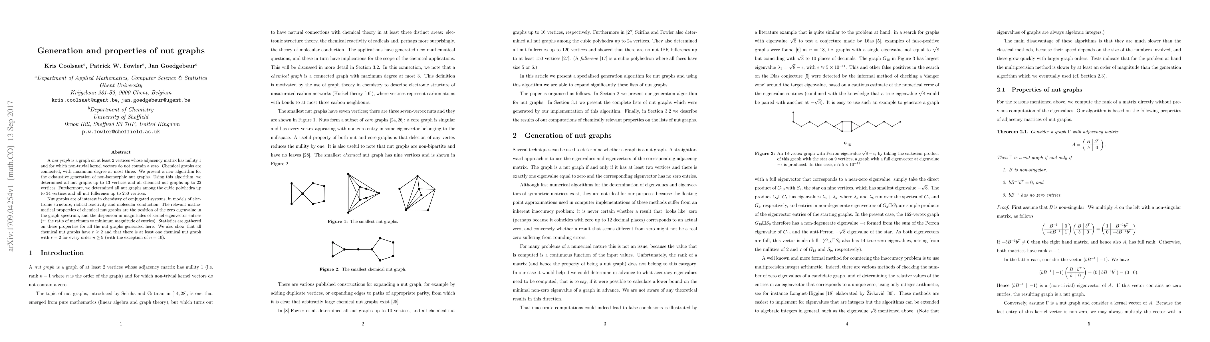 A nut graph is a graph on at least 2 vertices whose adjacency matrix has nullity 1 and for which non-trivial kernel vectors do not contain a zero. Chemical graphs are connected, with maximum degree at most three. We present a new algorithm for the exhaustive generation of non-isomorphic nut graphs. Using this algorithm, we determined all nut graphs up to 13 vertices and all chemical nut graphs up to 22 vertices. Furthermore, we determined all nut graphs among the cubic polyhedra up to 34 vertices and all nut fullerenes up to 250 vertices. Nut graphs are of interest in chemistry of conjugated systems, in models of electronic structure, radical reactivity and molecular conduction. The relevant mathematical properties of chemical nut graphs are the position of the zero eigenvalue in the graph spectrum, and the dispersion in magnitudes of kernel eigenvector entries ($r$: the ratio of maximum to minimum magnitude of entries). Statistics are gathered on these properties for all the nut graphs generated here. We also show that all chemical nut graphs have $r \ge 2$ and that there is at least one chemical nut graph with $r = 2$ for every order $n \ge 9$ (with the exception of $n = 10$).