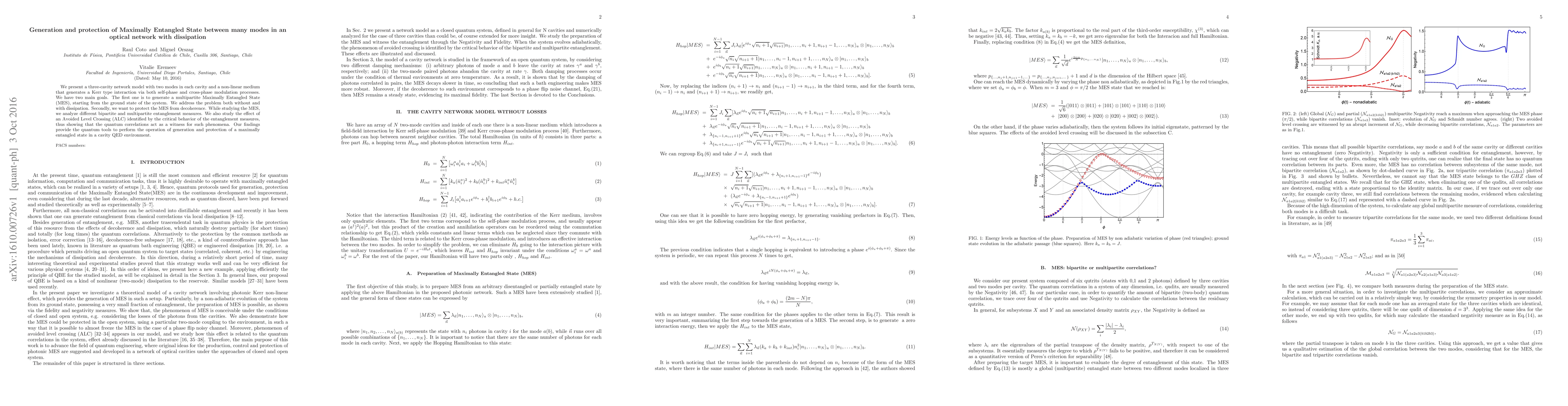 We present a three-cavity network model with two modes in each cavity and a non-linear medium that generates a Kerr type interaction via both self-phase and cross-phase modulation processes. We have two main goals. The first one is to generate a multipartite Maximally Entangled State (MES), starting from the ground state of the system. We address the problem both without and with dissipation. Secondly, we want to protect the MES from decoherence. While studying the MES, we analyze different bipartite and multipartite entanglement measures. We also study the effect of an Avoided Level Crossing (ALC) identified by the critical behavior of the entanglement measures, thus showing that the quantum correlations act as a witness for such phenomena. Our findings provide the quantum tools to perform the operation of generation and protection of a maximally entangled state in a cavity QED environment.