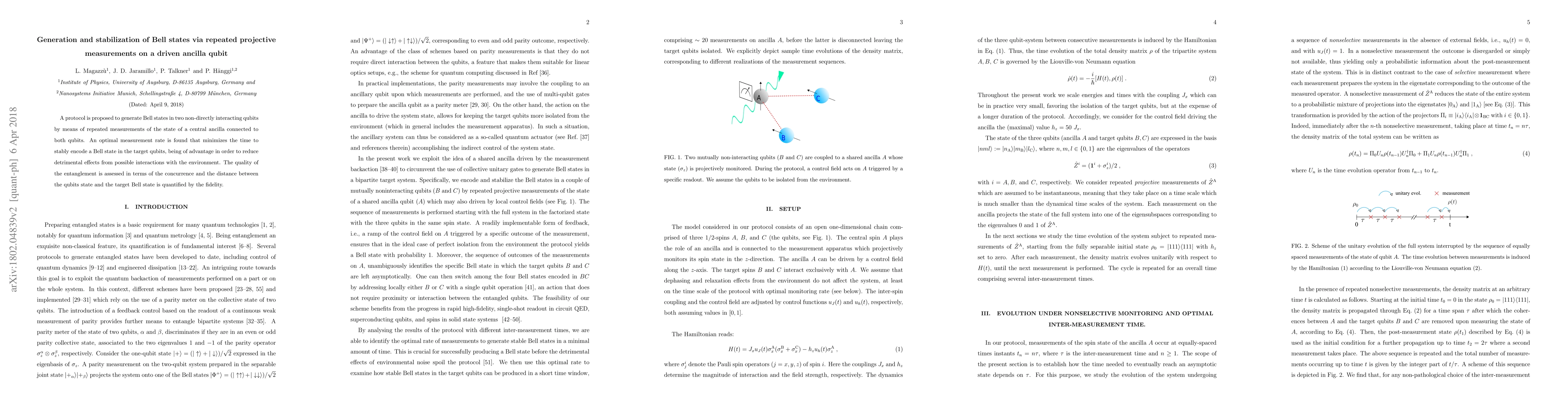 A protocol is proposed to generate Bell states in two non-directly interacting qubits by means of repeated measurements of the state of a central ancilla connected to both qubits. An optimal measurement rate is found that minimizes the time to stably encode a Bell state in the target qubits, being of advantage in order to reduce detrimental effects from possible interactions with the environment. The quality of the entanglement is assessed in terms of the concurrence and the distance between the qubits state and the target Bell state is quantified by the fidelity.