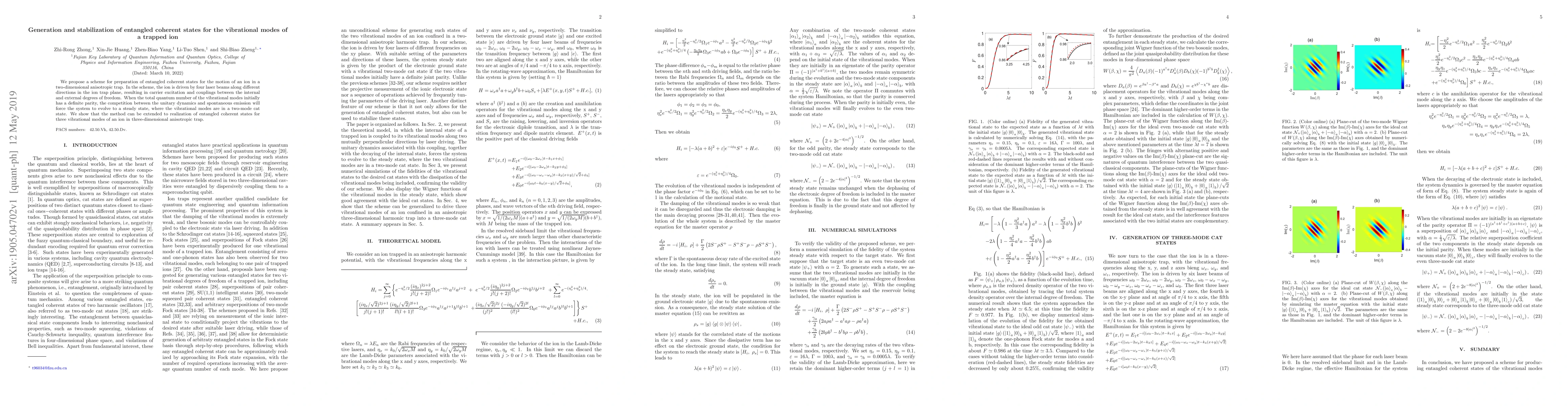 This paper proposes a method to generate entangled coherent states for the vibrational modes of a trapped ion using laser beams to drive carrier excitation and coupling between internal and external degrees of freedom. The scheme stabilizes the system in a two-mode cat state, and it can be extended to three-dimensional traps.