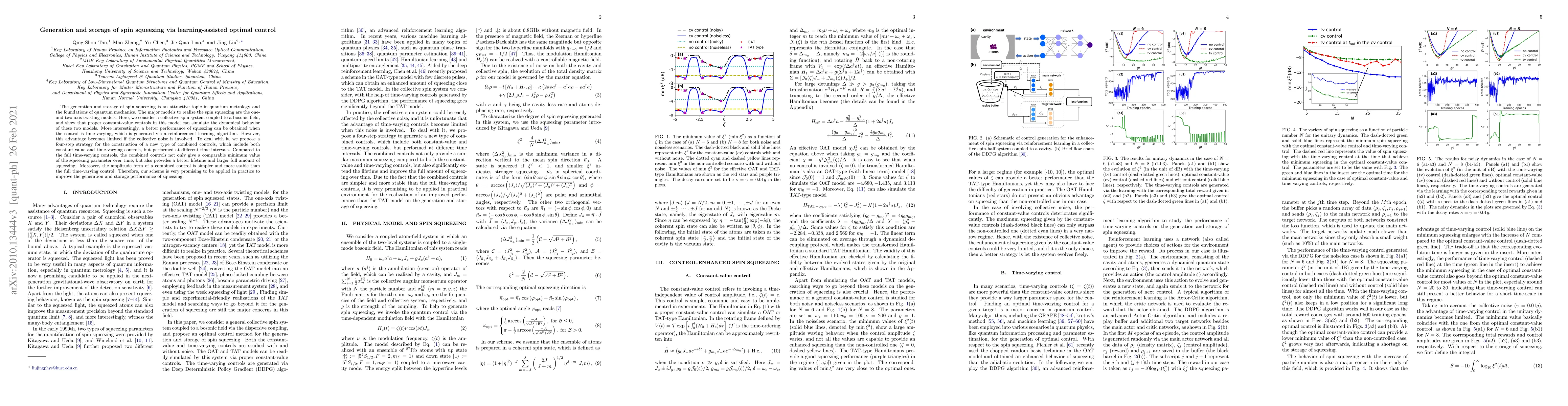 This paper explores the generation and storage of spin squeezing using optimal control techniques, demonstrating that time-varying controls generated by reinforcement learning can improve squeezing performance. To address collective noise limitations, a four-step strategy combining constant and time-varying controls is proposed, achieving comparable squeezing efficiency with better stability and longer storage lifetime.