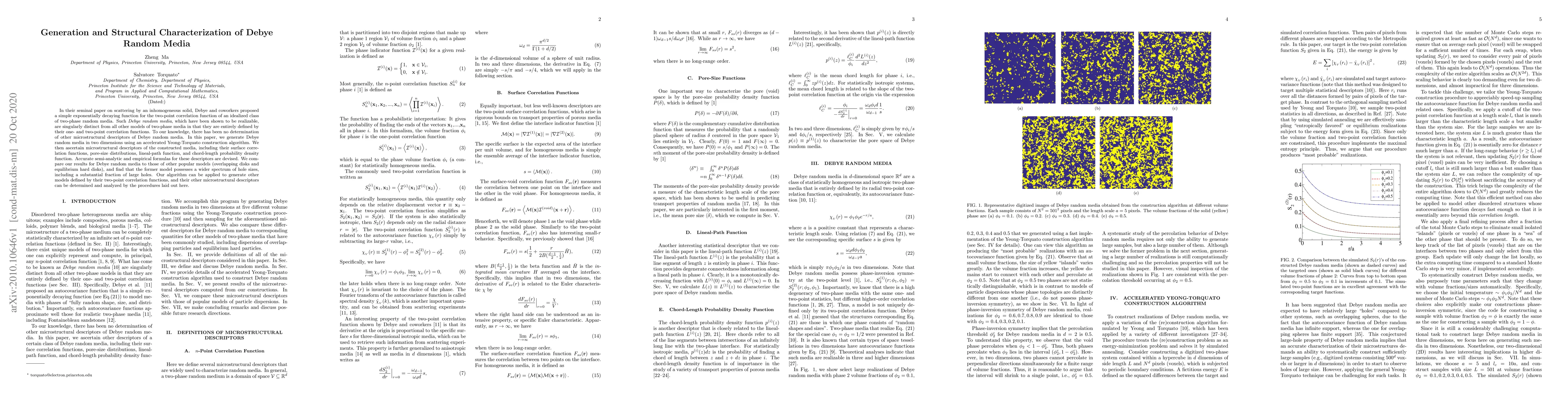 In their seminal paper on scattering by an inhomogeneous solid, Debye and coworkers proposed a simple exponentially decaying function for the two-point correlation function of an idealized class of two-phase random media. Such {\it Debye random media}, which have been shown to be realizable, are singularly distinct from all other models of two-phase media in that they are entirely defined by their one- and two-point correlation functions. To our knowledge, there has been no determination of other microstructural descriptors of Debye random media. In this paper, we generate Debye random media in two dimensions using an accelerated Yeong-Torquato construction algorithm. We then ascertain microstructural descriptors of the constructed media, including their surface correlation functions, pore-size distributions, lineal-path function, and chord-length probability density function. Accurate semi-analytic and empirical formulas for these descriptors are devised. We compare our results for Debye random media to those of other popular models (overlapping disks and equilibrium hard disks), and find that the former model possesses a wider spectrum of hole sizes, including a substantial fraction of large holes. Our algorithm can be applied to generate other models defined by their two-point correlation functions, and their other microstructural descriptors can be determined and analyzed by the procedures laid out here.