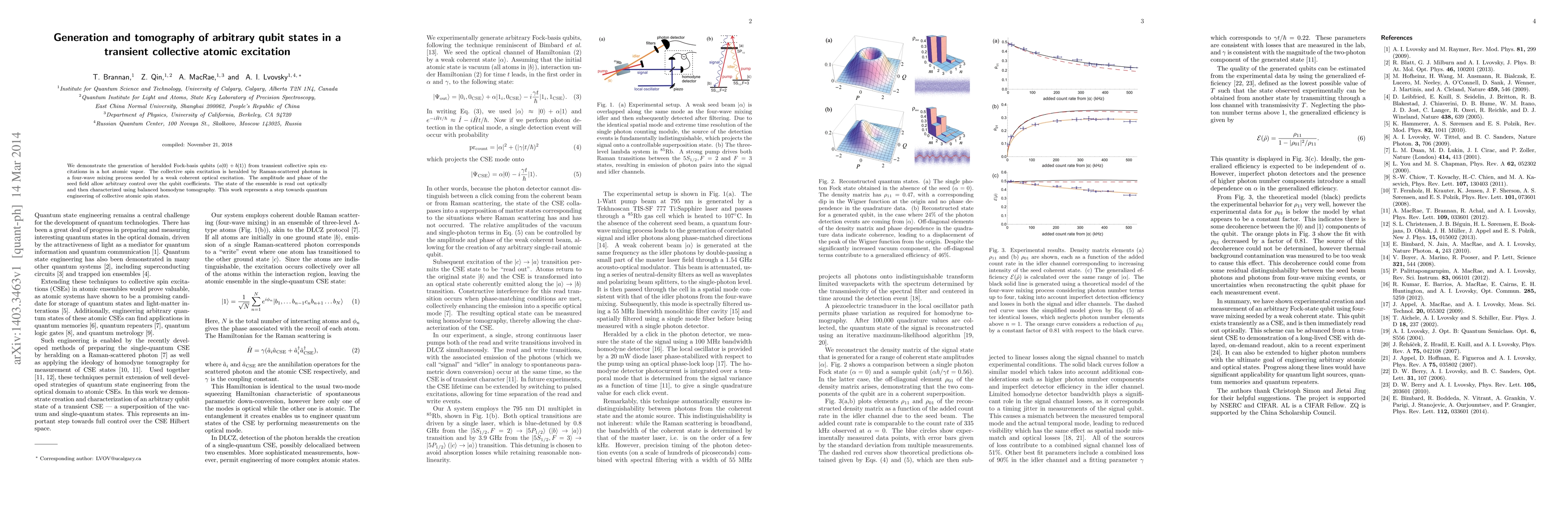 This paper demonstrates the generation of arbitrary qubit states from transient collective atomic spin excitations using a four-wave mixing process, and characterizes these states via balanced homodyne tomography, marking progress in quantum engineering of atomic spin states.