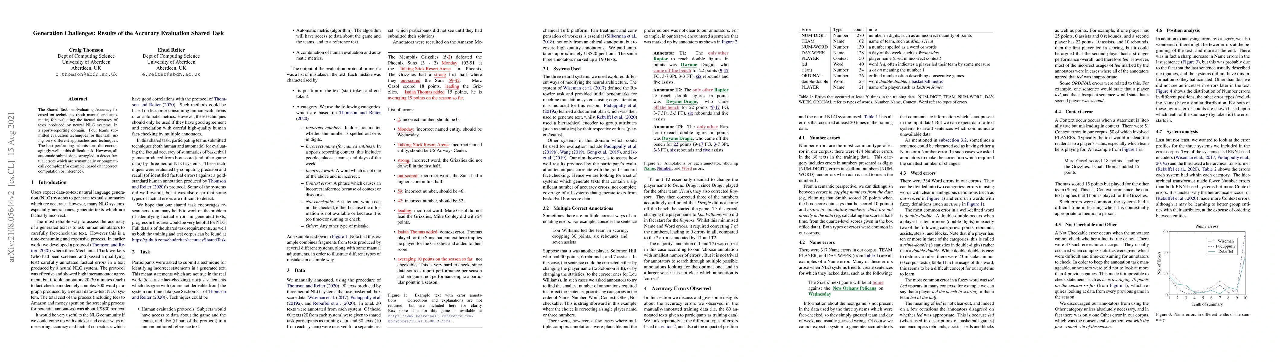 The Shared Task on Evaluating Accuracy focused on techniques (both manual and automatic) for evaluating the factual accuracy of texts produced by neural NLG systems, in a sports-reporting domain. Four teams submitted evaluation techniques for this task, using very different approaches and techniques. The best-performing submissions did encouragingly well at this difficult task. However, all automatic submissions struggled to detect factual errors which are semantically or pragmatically complex (for example, based on incorrect computation or inference).
