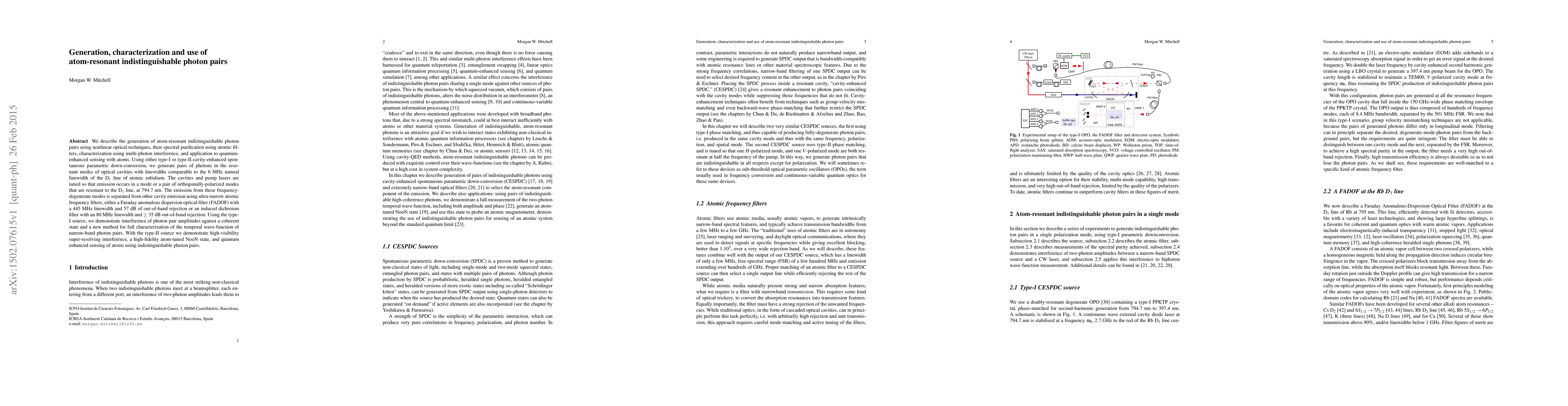 We describe the generation of atom-resonant indistinguishable photon pairs using nonlinear optical techniques, their spectral purification using atomic filters, characterization using multi-photon interference, and application to quantum-enhanced sensing with atoms. Using either type-I or type-II cavity-enhanced spontaneous parametric down-conversion, we generate pairs of photons in the resonant modes of optical cavities with linewidths comparable to the 6 MHz natural linewidth of the D$_1$ line of atomic rubidium. The cavities and pump lasers are tuned so that emission occurs in a mode or a pair of orthogonally-polarized modes that are resonant to the D$_1$ line, at 794.7 nm. The emission from these frequency-degenerate modes is separated from other cavity emission using ultra-narrow atomic frequency filters, either a Faraday anomalous dispersion optical filter (FADOF) with a 445MHz linewidth and 57 dB of out-of-band rejection or an induced dichroism filter with an 80 MHz linewidth and $\ge$35dB out-of-band rejection. Using the type-I source, we demonstrate interference of photon pair amplitudes against a coherent state and a new method for full characterization of the temporal wave-function of narrow-band photon pairs. With the type-II source we demonstrate high-visibility super-resolving interference, a high-fidelity atom-tuned NooN state, and quantum enhanced sensing of atoms using indistinguishable photon pairs.
