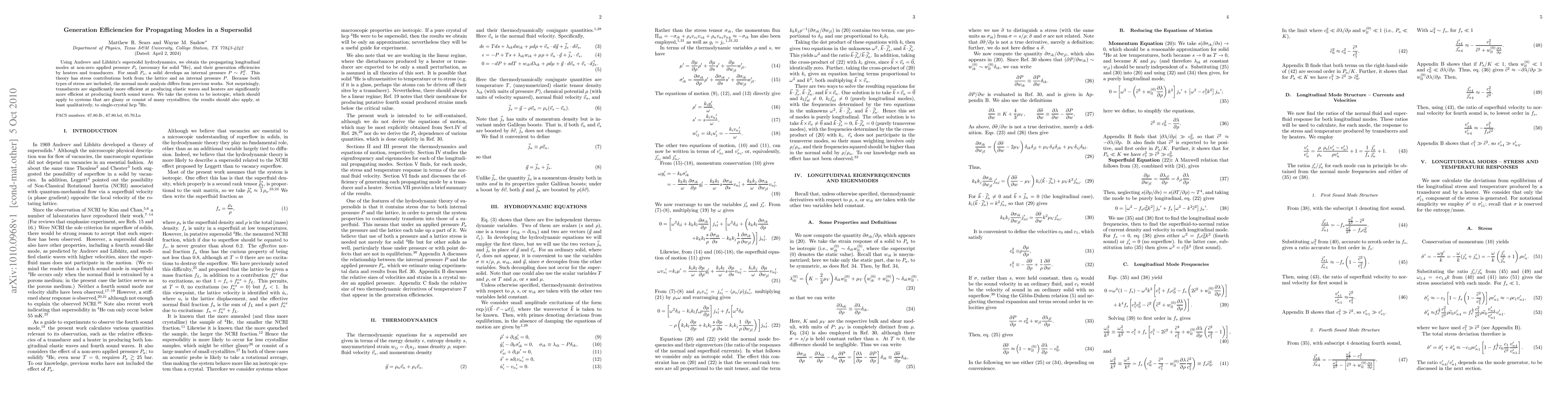 Using Andreev and Lifshitz's supersolid hydrodynamics, we obtain the propagating longitudinal modes at non-zero applied pressure $P_{a}$ (necessary for solid 4He), and their generation efficiencies by heaters and transducers. For small $P_{a}$, a solid develops an internal pressure $P \sim P_{a}^2$. This theory has stress contributions both from the lattice and an internal pressure $P$. Because both types of stress are included, the normal mode analysis differs from previous works. Not surprisingly, transducers are significantly more efficient at producing elastic waves and heaters are significantly more efficient at producing fourth sound waves. We take the system to be isotropic, which should apply to systems that are glassy or consist of many crystallites; the results should also apply, at least qualitatively, to single-crystal hcp 4He.