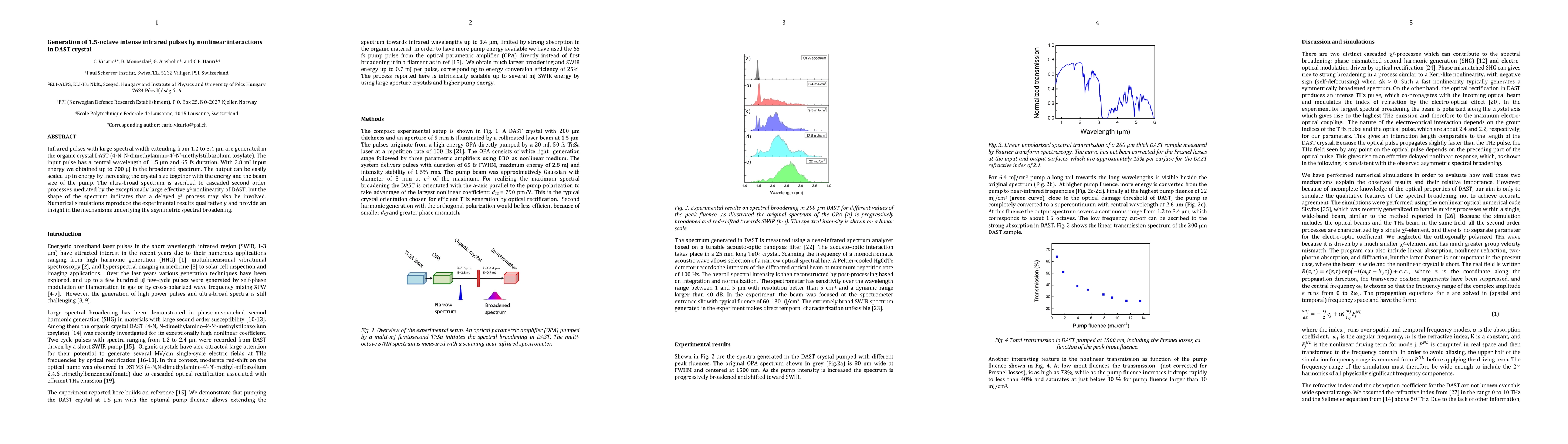 This paper reports the generation of intense 1.5-octave infrared pulses in DAST crystals through nonlinear interactions, achieving up to 700 µJ in a broad spectrum from 1.2 to 3.4 µm. The process is scalable and involves cascaded second-order processes and potentially delayed third-order effects.