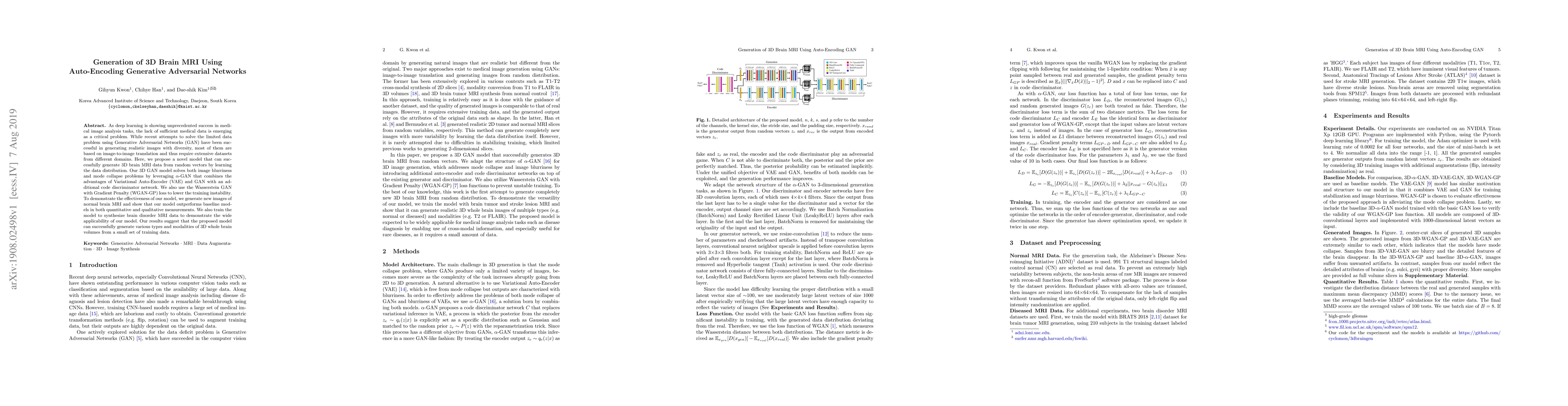 As deep learning is showing unprecedented success in medical image analysis tasks, the lack of sufficient medical data is emerging as a critical problem. While recent attempts to solve the limited data problem using Generative Adversarial Networks (GAN) have been successful in generating realistic images with diversity, most of them are based on image-to-image translation and thus require extensive datasets from different domains. Here, we propose a novel model that can successfully generate 3D brain MRI data from random vectors by learning the data distribution. Our 3D GAN model solves both image blurriness and mode collapse problems by leveraging alpha-GAN that combines the advantages of Variational Auto-Encoder (VAE) and GAN with an additional code discriminator network. We also use the Wasserstein GAN with Gradient Penalty (WGAN-GP) loss to lower the training instability. To demonstrate the effectiveness of our model, we generate new images of normal brain MRI and show that our model outperforms baseline models in both quantitative and qualitative measurements. We also train the model to synthesize brain disorder MRI data to demonstrate the wide applicability of our model. Our results suggest that the proposed model can successfully generate various types and modalities of 3D whole brain volumes from a small set of training data.