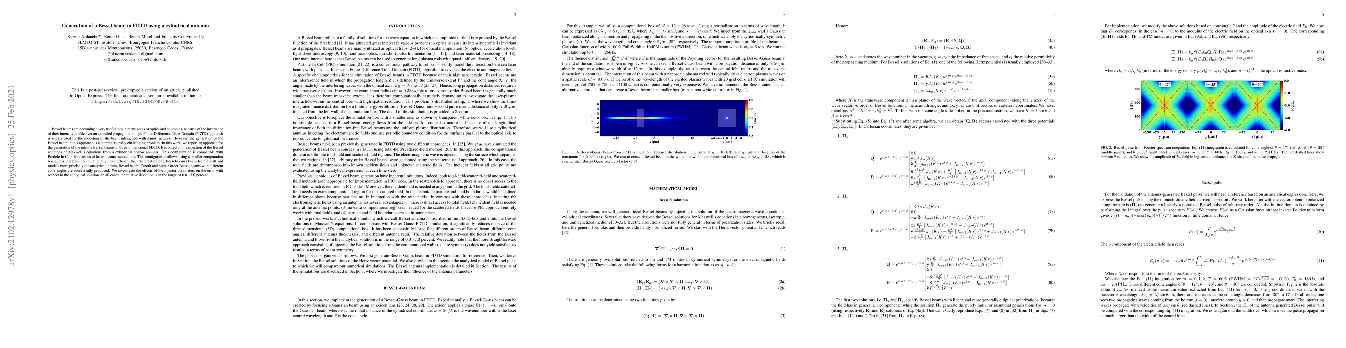 Bessel beams are becoming a very useful tool in many areas of optics and photonics, because of the invariance of their intensity profile over an extended propagation range. Finite-Difference-Time-Domain (FDTD) approach is widely used for the modeling of the beam interaction with nanostructures. However, the generation of the Bessel beam in this approach is a computationally challenging problem. In this work, we report an approach for the generation of the infinite Bessel beams in three-dimensional FDTD. It is based on the injection of the Bessel solutions of Maxwell's equations from a cylindrical hollow annulus. This configuration is compatible with Particle In Cell simulations of laser plasma interactions. This configuration allows using a smaller computation box and is therefore computationally more efficient than the creation of a Bessel-Gauss beam from a wall and models more precisely the analytical infinite Bessel beam. Zeroth and higher-order Bessel beams with different cone angles are successfully produced. We investigate the effects of the injector parameters on the error with respect to the analytical solution. In all cases, the relative deviation is in the range of 0.01-7.0 percent.