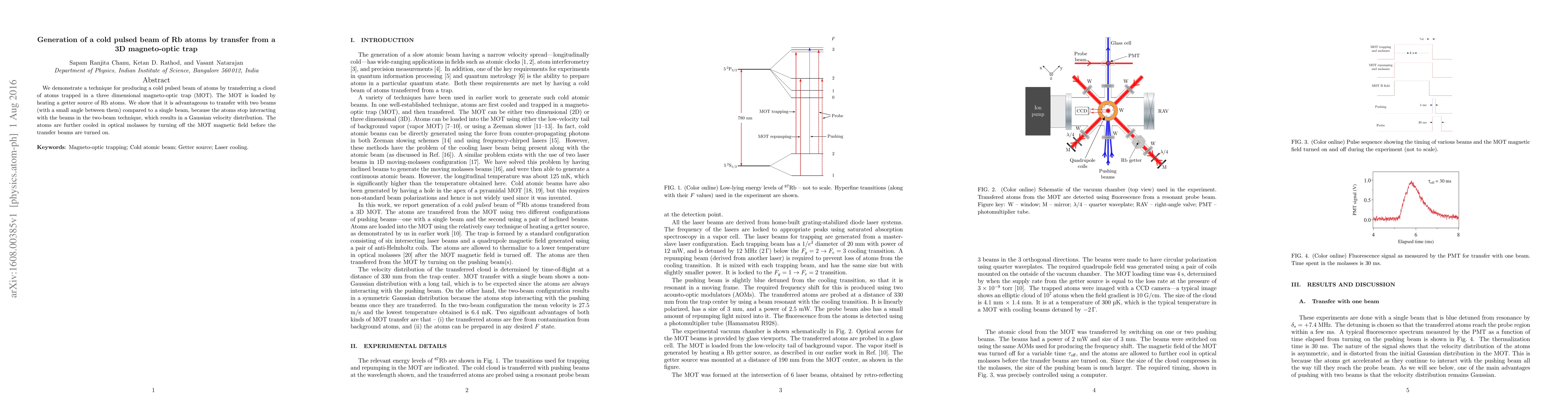This research presents a method to generate a cold pulsed beam of Rb atoms by transferring them from a three-dimensional magneto-optic trap (MOT). Utilizing two transfer beams at a small angle enhances the Gaussian velocity distribution and reduces interaction with the beams compared to a single beam.