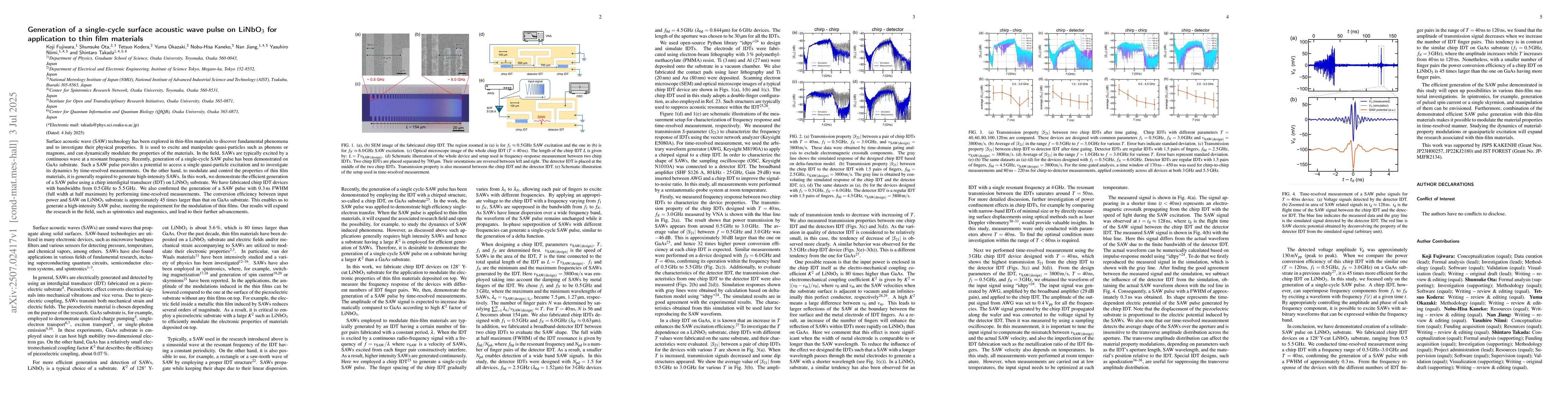 Surface acoustic wave (SAW) technology has been explored in thin-film materials to discover fundamental phenomena and to investigate their physical properties. It is used to excite and manipulate quasi-particles such as phonons or magnons, and can dynamically modulate the properties of the materials. In the field, SAWs are typically excited by a continuous wave at a resonant frequency. Recently, generation of a single-cycle SAW pulse has been demonstrated on GaAs substrate. Such a SAW pulse provides a potential to access a single quasi-particle excitation and to investigate its dynamics by time-resolved measurements. On the other hand, to modulate and control the properties of thin film materials, it is generally required to generate high-intensity SAWs. In this work, we demonstrate the efficient generation of a SAW pulse using a chirp interdigital transducer (IDT) on LiNbO$_3$ substrate. We have fabricated chirp IDT devices with bandwidths from 0.5 GHz to 5.5 GHz. We also confirmed the generation of a SAW pulse with 0.3 ns FWHM (full width at half maximum) by performing time-resolved measurements. The conversion efficiency between input power and SAW on LiNbO$_3$ substrate is approximately 45 times larger than that on GaAs substrate. This enables us to generate a high-intensity SAW pulse, meeting the requirement for the modulation of thin films. Our results will expand the research in the field, such as spintronics and magnonics, and lead to their further advancements.