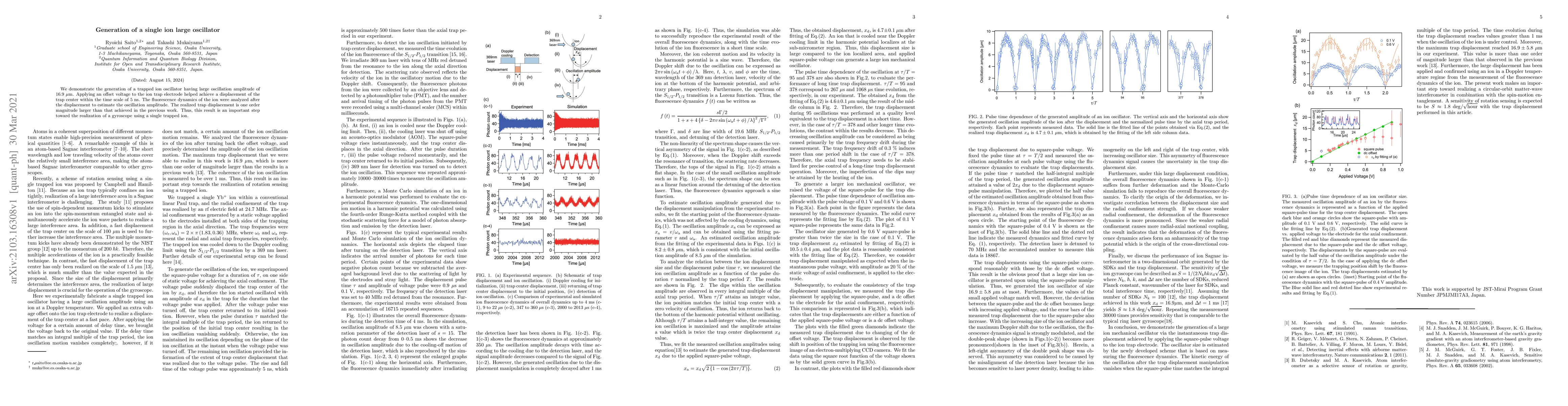 We demonstrate the generation of a trapped ion oscillator having large oscillation amplitude of $16.9~{\rm \mu m}$. Applying an offset voltage to the ion trap electrode helped achieve a displacement of the trap center within the time scale of 5 ns. The fluorescence dynamics of the ion were analyzed after the displacement to estimate the oscillation amplitude. The realized trap displacement is one order magnitude larger than that achieved in the previous work. Thus, this result is an important step toward the realization of a gyroscope using a single trapped ion.