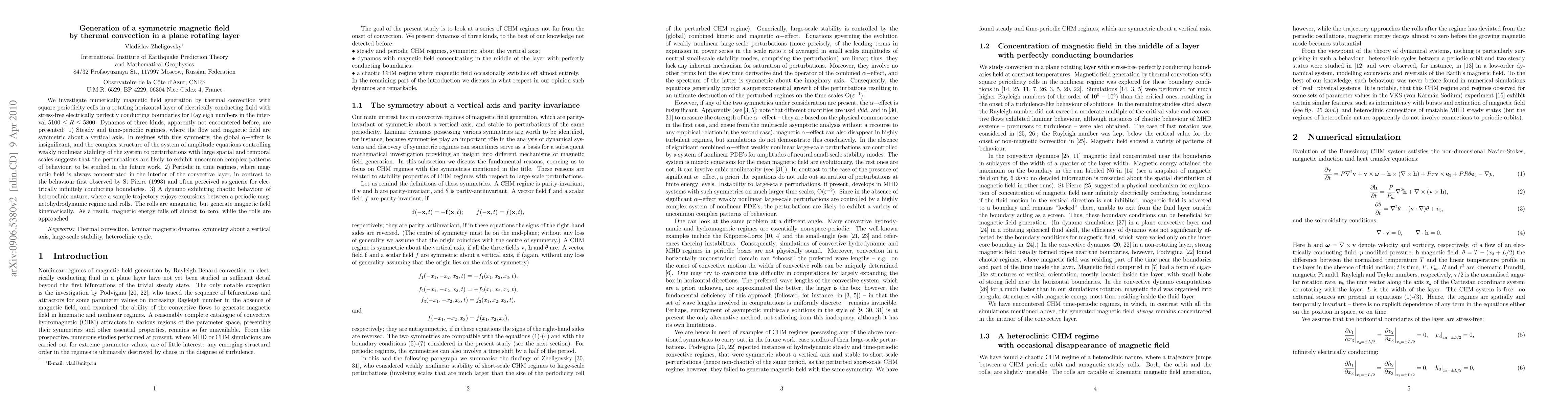 We investigate numerically magnetic field generation by thermal convection with square periodicity cells in a rotating horizontal layer of electrically-conducting fluid with stress-free electrically perfectly conducting boundaries for Rayleigh numbers in the interval 5100\le R\le 5800. Dynamos of three kinds, apparently not encountered before, are presented: 1) Steady and time-periodic regimes, where the flow and magnetic field are symmetric about a vertical axis. In regimes with this symmetry, the global alpha-effect is insignificant, and the complex structure of the system of amplitude equations controlling weakly nonlinear stability of the system to perturbations with large spatial and temporal scales suggests that the perturbations are likely to exhibit uncommon complex patterns of behaviour, to be studied in the future work. 2) Periodic in time regimes, where magnetic field is always concentrated in the interior of the convective layer, in contrast to the behaviour first observed by St Pierre (1993) and often perceived as generic for electrically infinitely conducting boundaries. 3) A dynamo exhibiting chaotic behaviour of heteroclinic nature, where a sample trajectory enjoys excursions between a periodic magnetohydrodynamic regime and rolls. The rolls are amagnetic, but generate magnetic field kinematically. As a result, magnetic energy falls off almost to zero, while the rolls are approached.