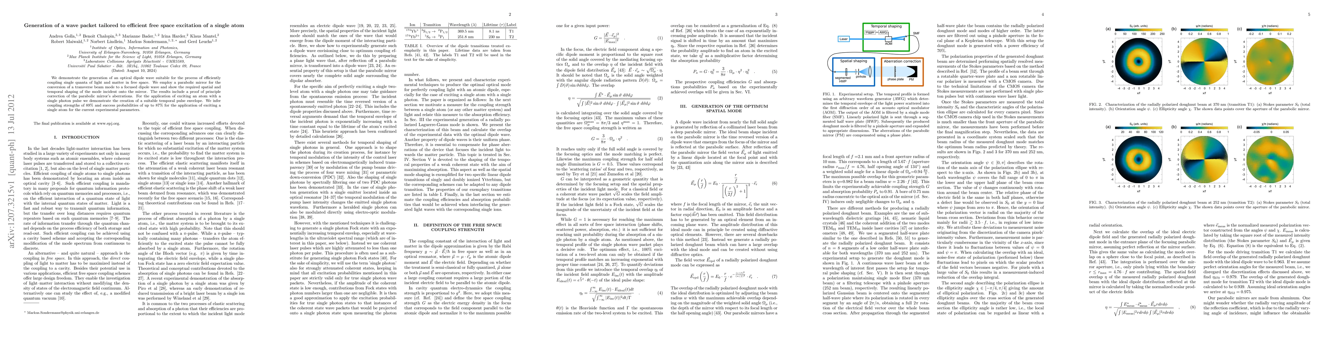 We demonstrate the generation of an optical dipole wave suitable for the process of efficiently coupling single quanta of light and matter in free space. We employ a parabolic mirror for the conversion of a transverse beam mode to a focused dipole wave and show the required spatial and temporal shaping of the mode incident onto the mirror. The results include a proof of principle correction of the parabolic mirror's aberrations. For the application of exciting an atom with a single photon pulse we demonstrate the creation of a suitable temporal pulse envelope. We infer coupling strengths of 89% and success probabilities of up to 87% for the application of exciting a single atom for the current experimental parameters.