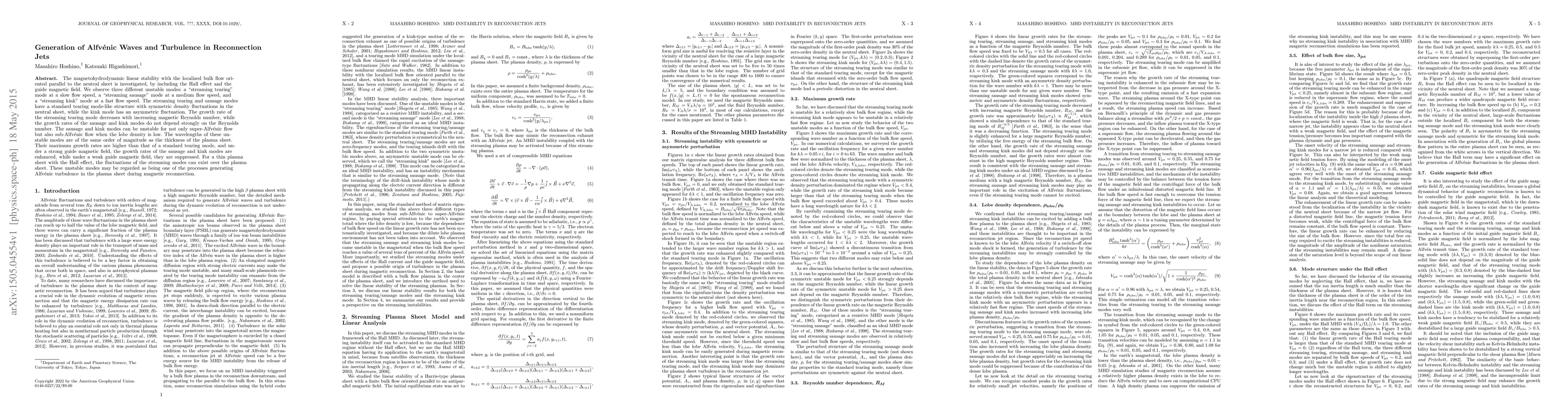This paper investigates magnetohydrodynamic linear stability in reconnection jets, identifying three unstable modes: streaming tearing, sausage, and kink. The growth rates of these modes vary with flow speed and magnetic conditions, suggesting they contribute to Alfvénic turbulence in plasma sheets during magnetic reconnection.