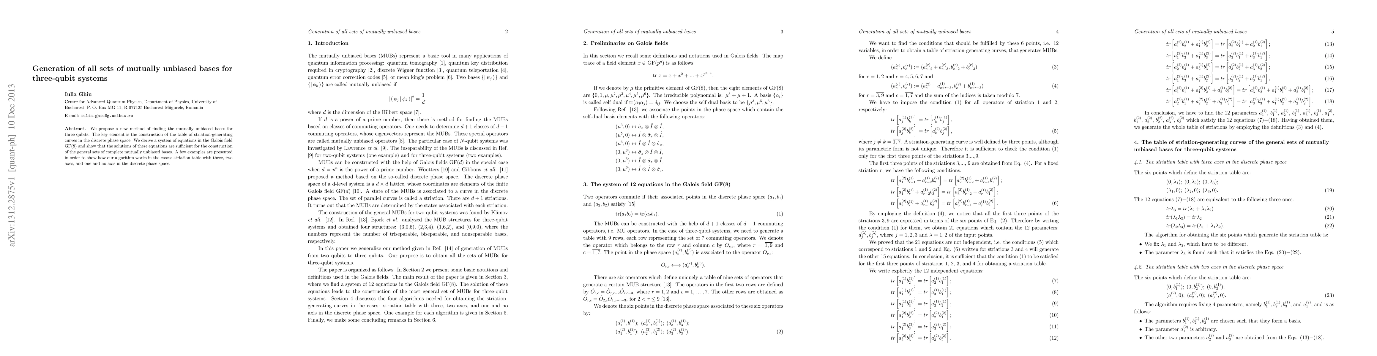 Researchers developed a method to find mutually unbiased bases for three-qubit systems, using a new approach in discrete phase space that involves solving equations in the Galois field GF(8). The solution provides general sets of complete mutually unbiased bases.