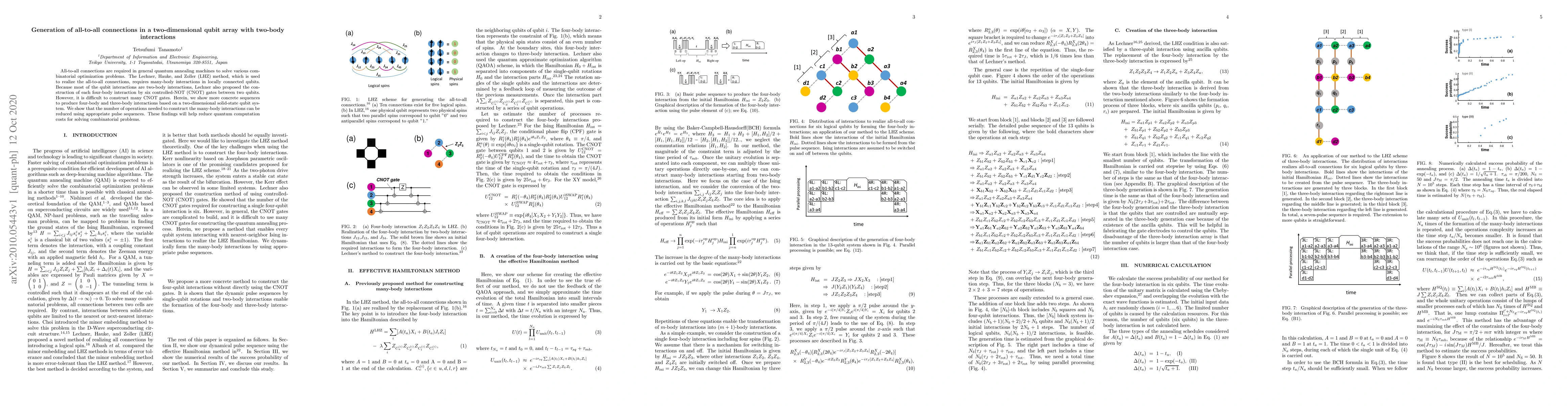 This research presents a method to generate all-to-all connections in a 2D qubit array using only two-body interactions, reducing the need for many-body interactions as previously proposed. It introduces specific sequences for constructing four-body and three-body interactions, thereby lowering the quantum computation costs for combinatorial problem-solving in solid-state qubit systems.