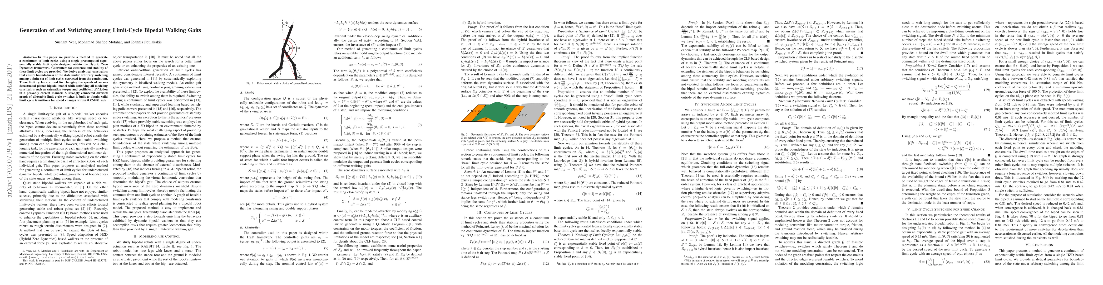 This paper presents a method for generating and switching between various stable limit cycles in a bipedal walking model, ensuring stability and boundedness during transitions. It uses a precomputed limit cycle within the Hybrid Zero Dynamics framework and constructs a directed graph for valid speed changes between 0.42-0.81 m/s.