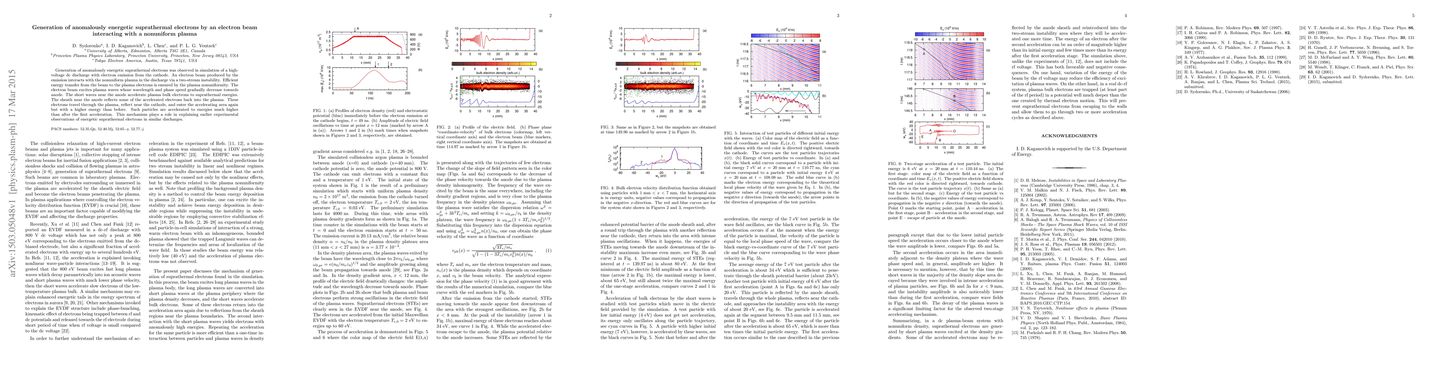 Generation of anomalously energetic suprathermal electrons was observed in simulation of a high- voltage dc discharge with electron emission from the cathode. An electron beam produced by the emission interacts with the nonuniform plasma in the discharge via a two-stream instability. Efficient energy transfer from the beam to the plasma electrons is ensured by the plasma nonuniformity. The electron beam excites plasma waves whose wavelength and phase speed gradually decrease towards anode. The short waves near the anode accelerate plasma bulk electrons to suprathermal energies. The sheath near the anode reflects some of the accelerated electrons back into the plasma. These electrons travel through the plasma, reflect near the cathode, and enter the accelerating area again but with a higher energy than before. Such particles are accelerated to energies much higher than after the first acceleration. This mechanism plays a role in explaining earlier experimental observations of energetic suprathermal electrons in similar discharges.