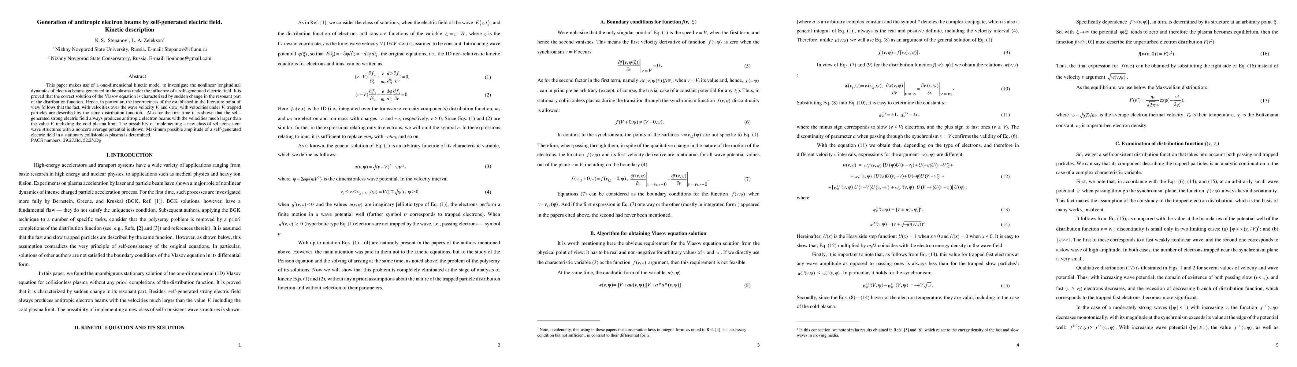This paper makes use of a one-dimensional kinetic model to investigate the nonlinear longitudinal dynamics of electron beams generated in the plasma under the influence of a self-generated electric field. It is expressed as where is a wave potential, , and charge particle distribution functions satisfy the Vlasov equation. It is proved that its correct solution is characterized by sudden change in the resonant part of the distribution function. Hence, in particular, the incorrectness of the established in the literature point of view follows that the fast, with velocities over V, and slow, with velocities under V, trapped particles are described by the same distribution function. Also for the first time it is shown that the self-generated strong electric field always produces antitropic electron beams with the velocities much larger than the value V, including the cold plasma limit. The possibility of implementing a new class of self-consistent wave structures with a nonzero average potential is shown. Maximum possible amplitude of a self-generated electric field in a stationary collisionless plasma is determined.