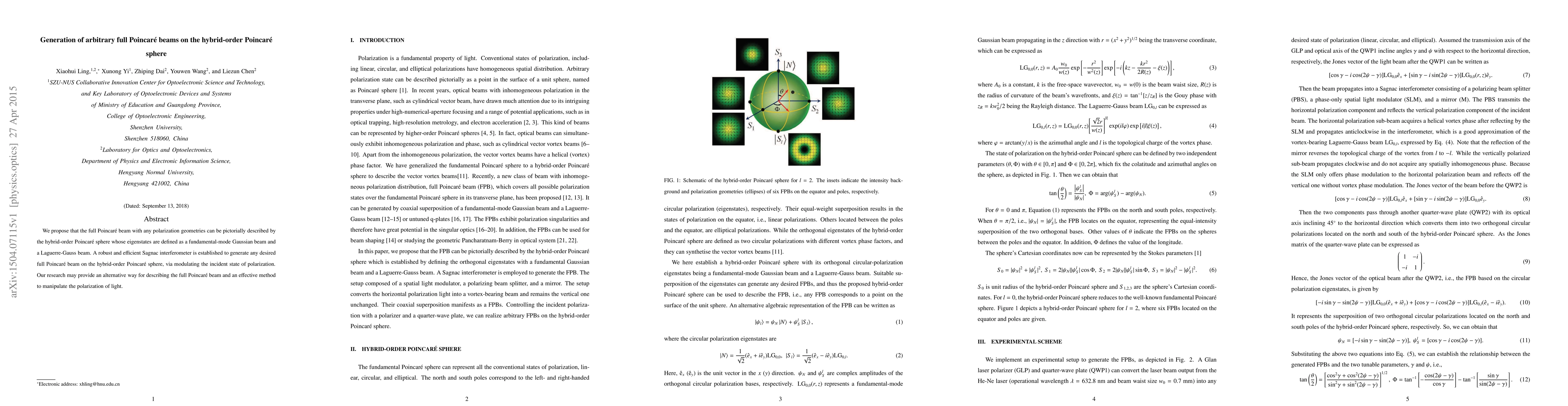 This paper proposes a method to generate arbitrary full Poincaré beams using a hybrid-order Poincaré sphere, defining eigenstates as fundamental-mode Gaussian and Laguerre-Gauss beams. A Sagnac interferometer is utilized to modulate polarization states, offering an alternative description and effective manipulation of light polarization.