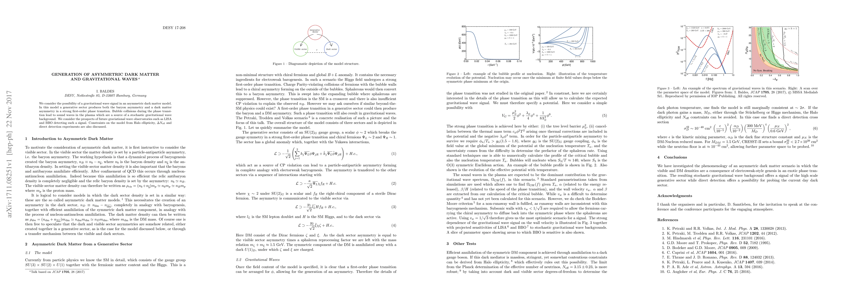 This paper explores the generation of asymmetric dark matter and gravitational waves from a strong first-order phase transition, where bubble collisions produce a stochastic gravitational wave background. It discusses potential detection by future observatories like LISA and BBO, and examines constraints from halo ellipticity, $\Delta N_{\rm eff}$, and direct detection experiments.