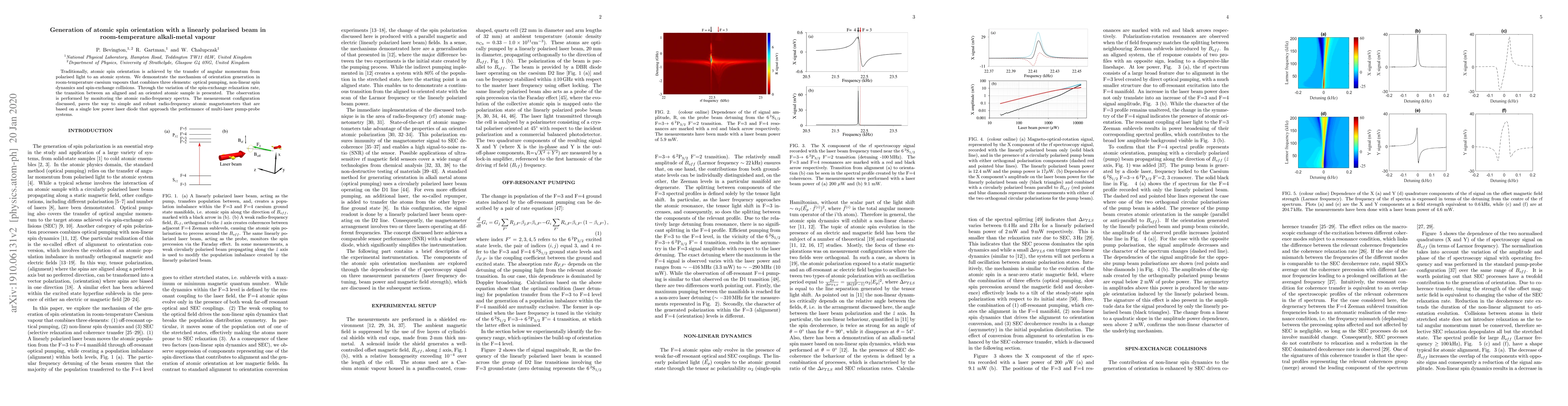 Traditionally, atomic spin orientation is achieved by the transfer of angular momentum from polarised light to an atomic system. We demonstrate the mechanism of orientation generation in room-temperature caesium vapours that combines three elements: optical pumping, non-linear spin dynamics and spin-exchange collisions. Through the variation of the spin-exchange relaxation rate, the transition between an aligned and an oriented atomic sample is presented. The observation is performed by monitoring the atomic radio-frequency spectra. The measurement configuration discussed, paves the way to simple and robust radio-frequency atomic magnetometers that are based on a single low power laser diode that approach the performance of multi-laser pump-probe systems.