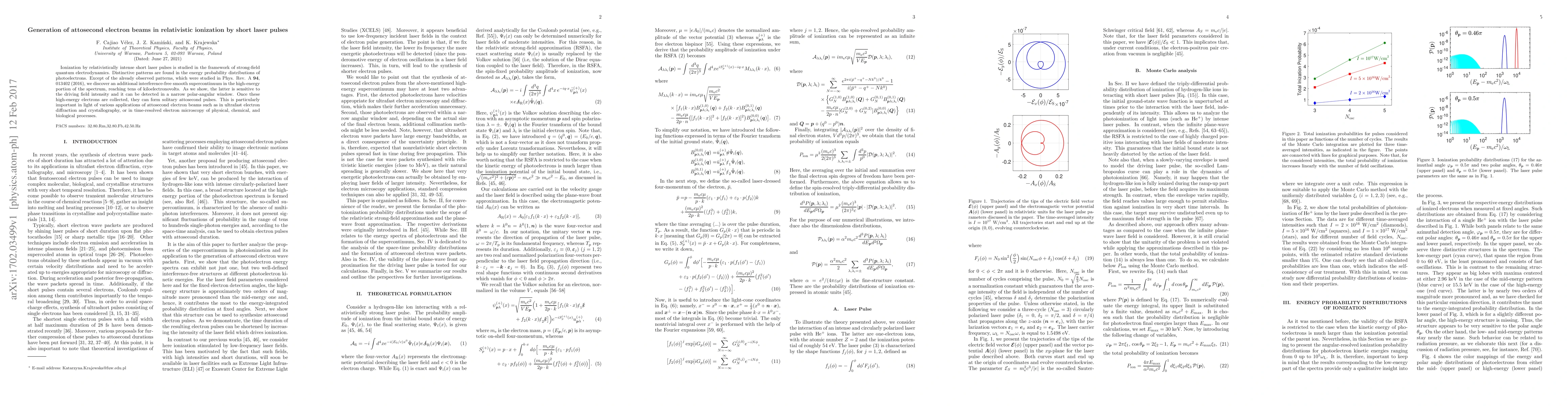 This paper investigates the generation of attosecond electron beams through relativistic ionization by short laser pulses, revealing a smooth supercontinuum in the high-energy photoelectron spectrum. These high-energy electrons can be collected to form solitary attosecond pulses, which are crucial for applications in ultrafast electron diffraction and time-resolved microscopy.