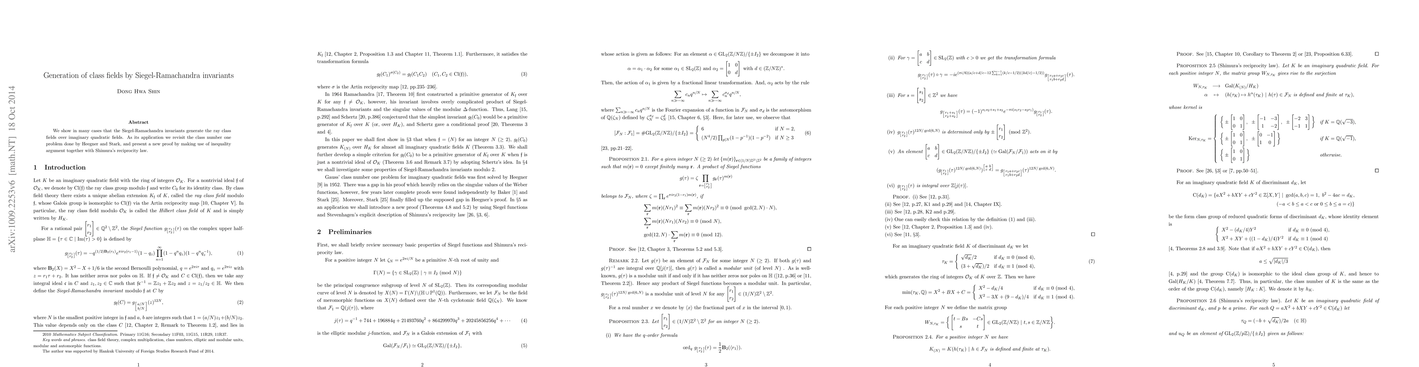 Summary: This paper demonstrates that Siegel-Ramachandra invariants serve as primitive generators for ray class fields of imaginary quadratic fields, providing a modern explanation for the class number one problem solution via Shimura's reciprocity law.