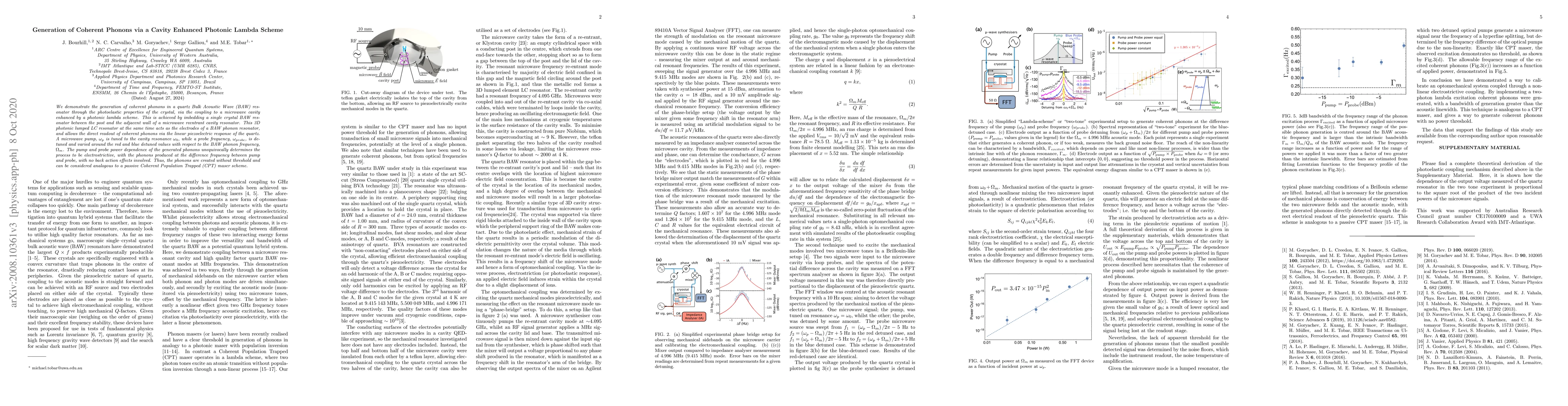 This research demonstrates the generation of coherent phonons in a quartz Bulk Acoustic Wave resonator using a microwave cavity enhanced by a photonic lambda scheme. The phonons are produced electrostrictively without threshold, at the difference frequency between microwave pump and probe frequencies, akin to a Coherent Population Trapped maser scheme.