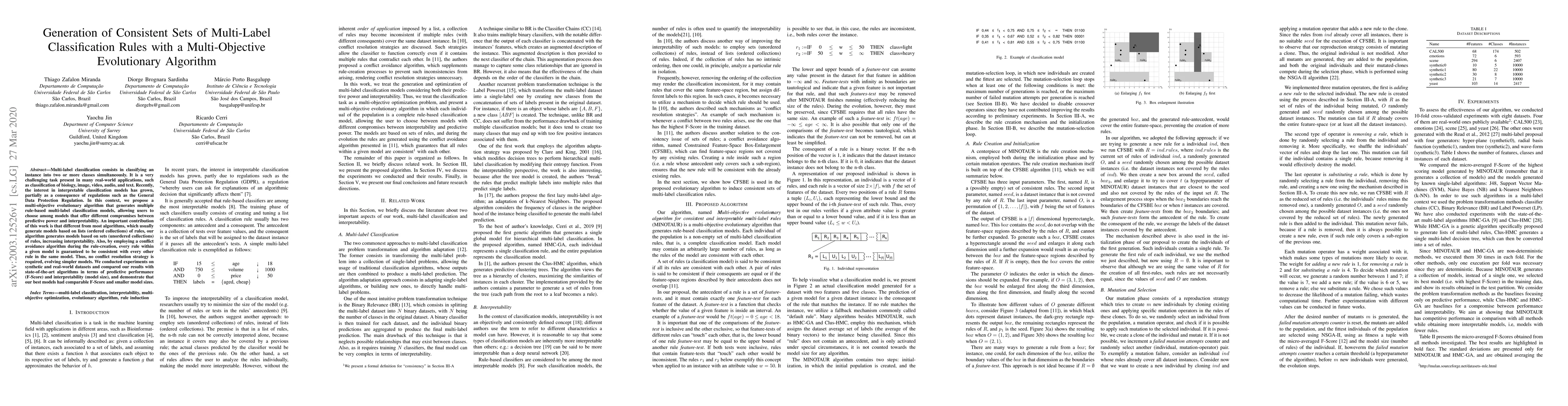 This paper proposes a multi-objective evolutionary algorithm to generate consistent sets of multi-label classification rules, enhancing interpretability and avoiding conflicts. Experiments show comparable predictive performance and smaller model sizes compared to state-of-the-art methods.